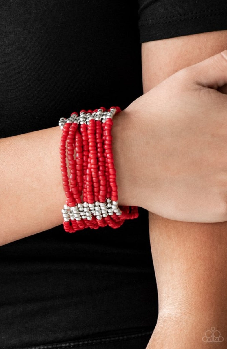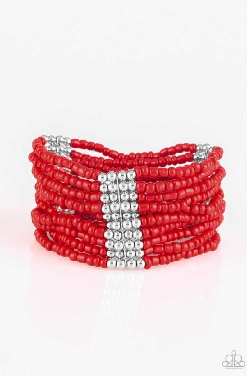 Joined together with metallic fittings, countless red seed beads are threaded along stretchy elastic bands. Sections of dainty silver beads are sprinkled along the colorful layers, adding hints of shimmer to the seasonal palette.