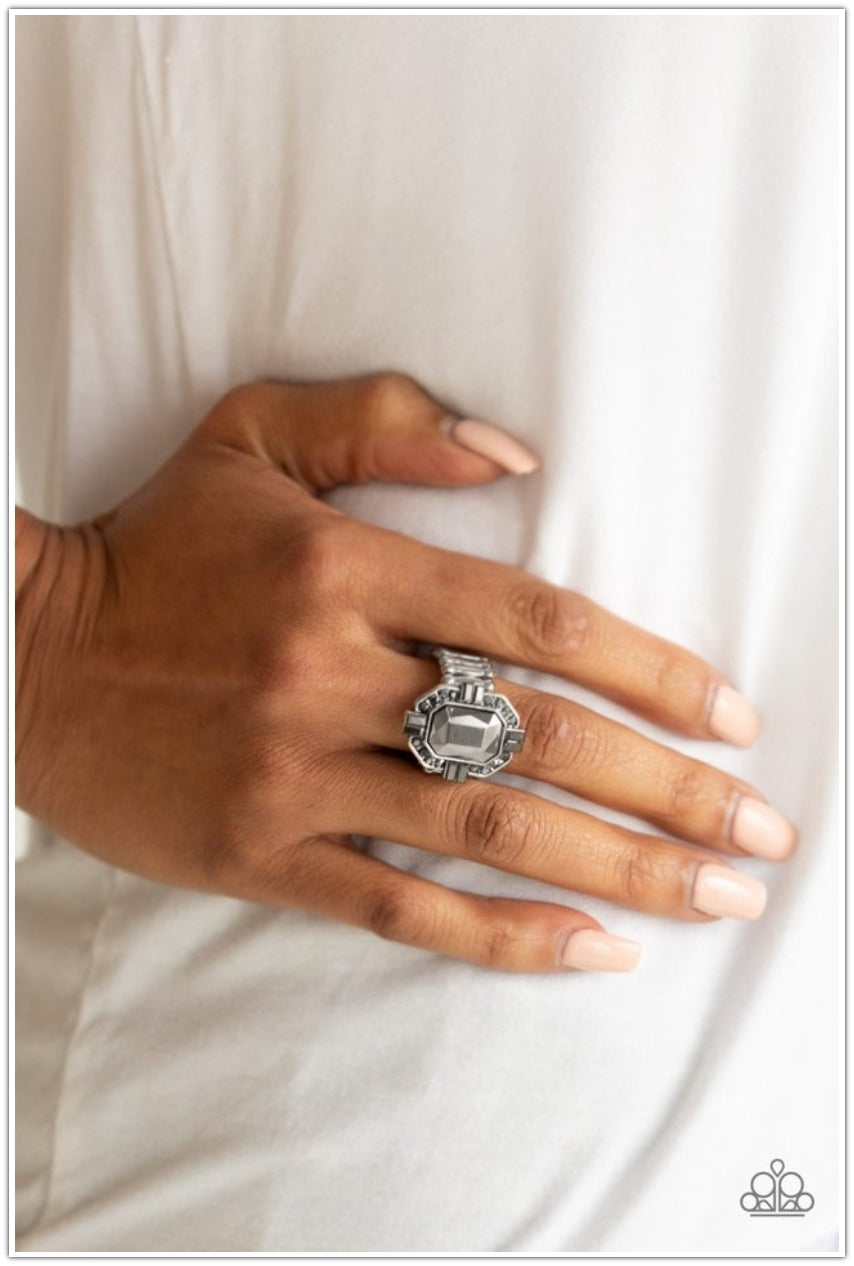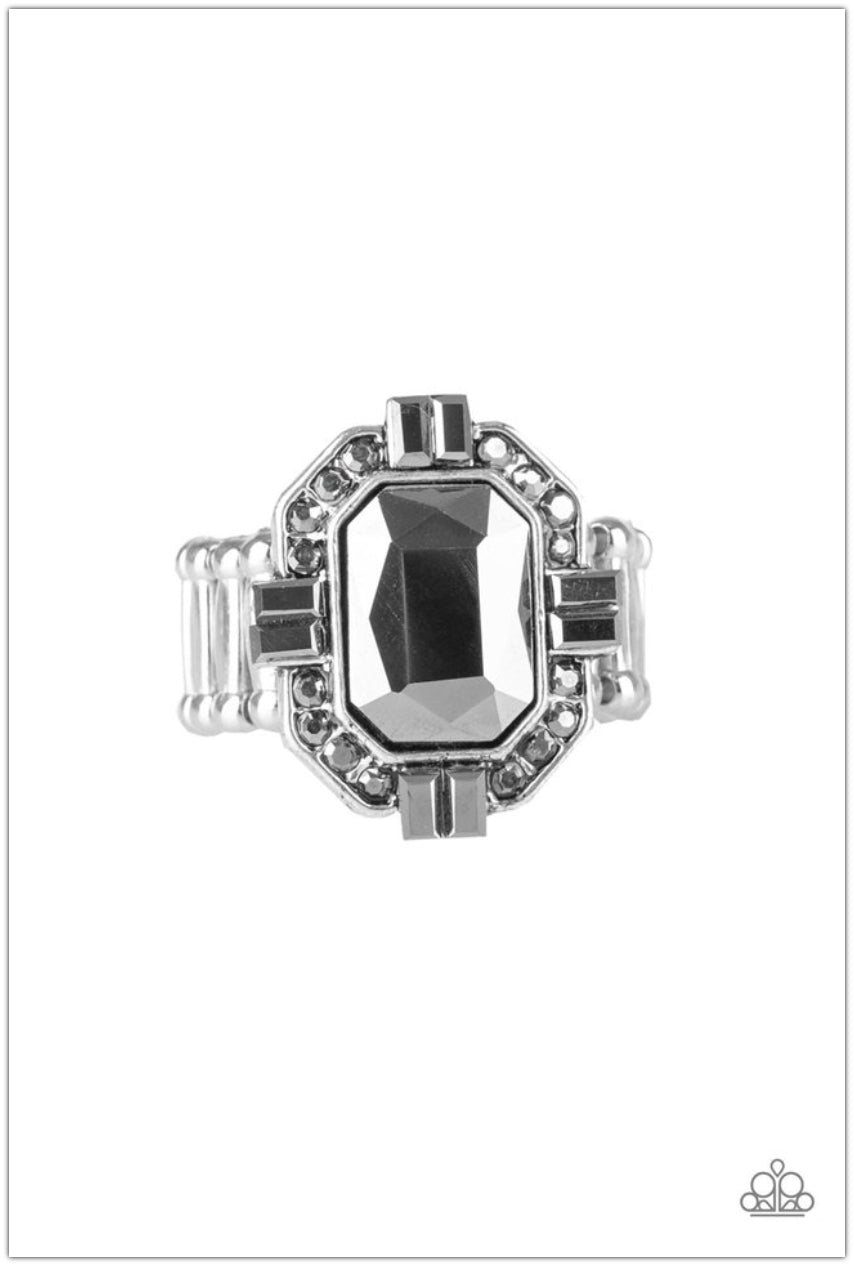 Featuring a regal emerald-style cut, a faceted hematite gem is pressed into the center of a silver frame radiating with smoky hematite rhinestones. Features a stretchy band for a flexible fit.