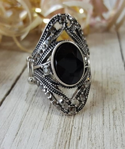 Radiating with dainty hematite rhinestones, studded silver bands whirl across the finger, coalescing into an ornate frame. An oversized black rhinestone is pressed into the center of the band for a dramatic finish. Features a stretchy band for a flexible fit.