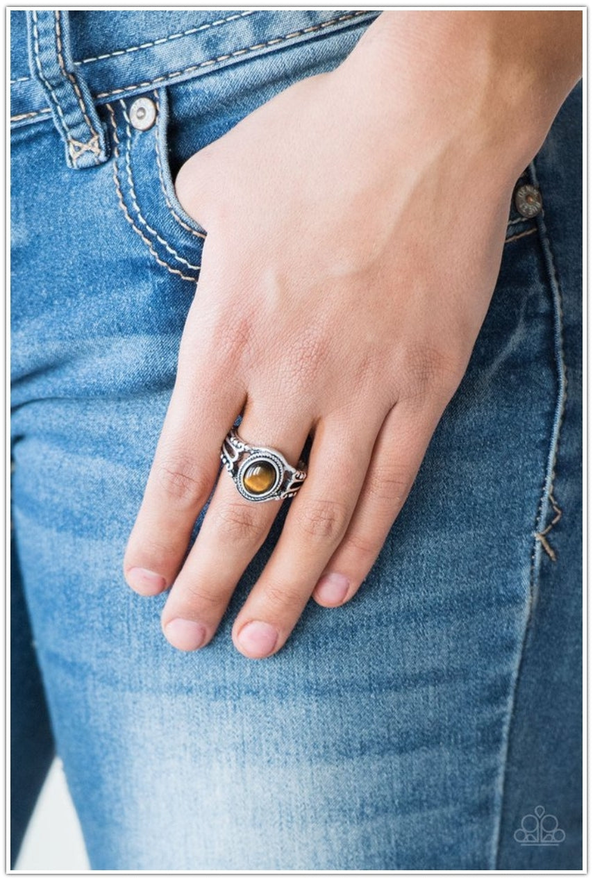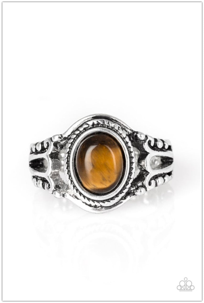 A tranquil tiger's eye stone is pressed into the center of a studded silver band for a seasonal look. Features a dainty stretchy band for a flexible fit.