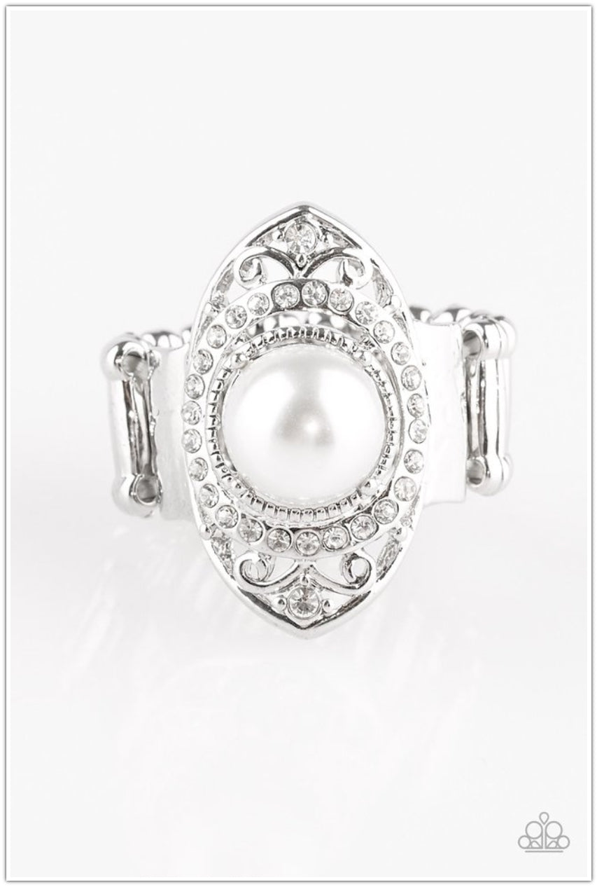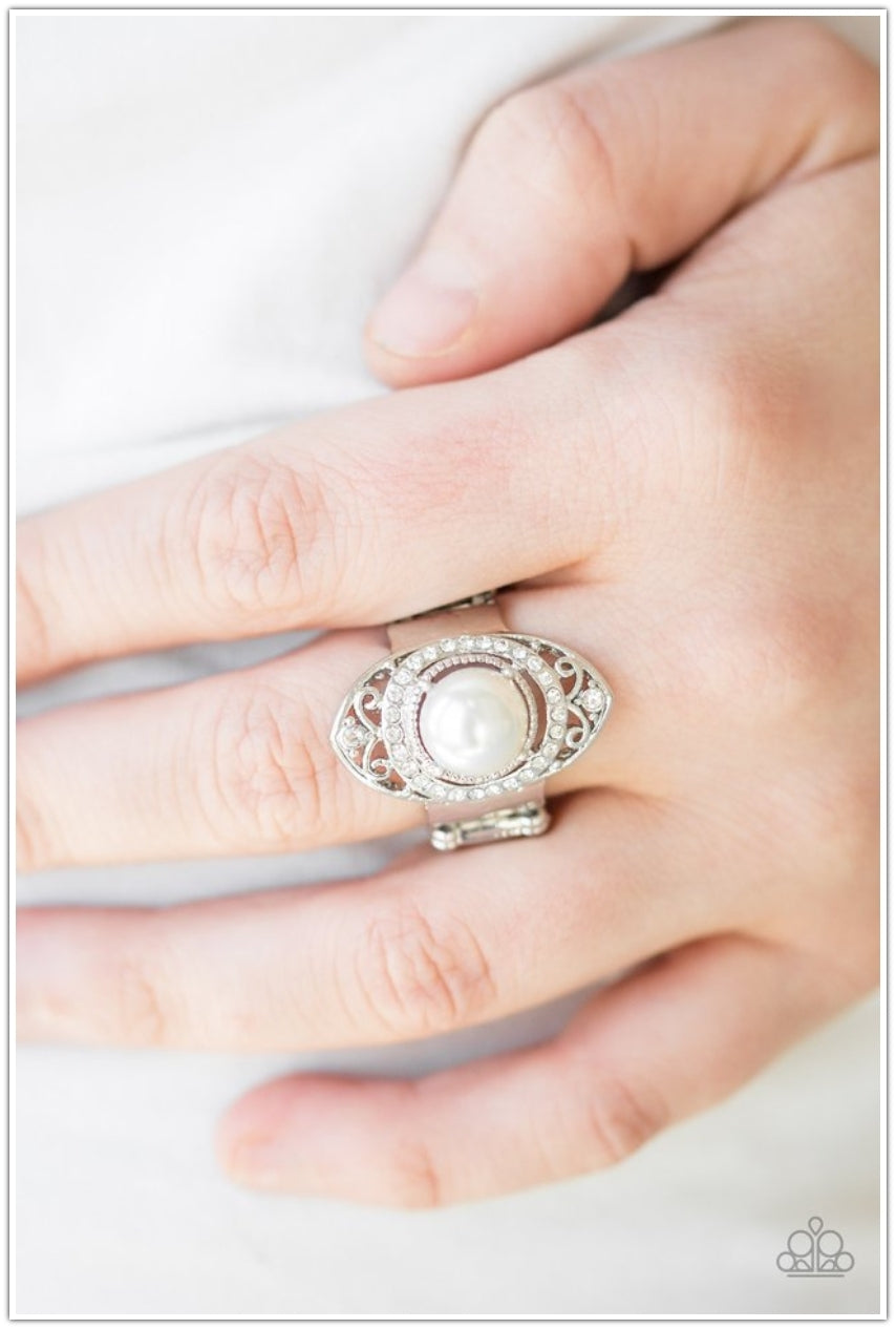 A pearly white bead sits atop an ornate silver frame, creating the illusion of a floating centerpiece. Glassy white rhinestones are sprinkled along the frilly frame for a glamourous finish. Features a dainty stretchy band for a flexible fit.