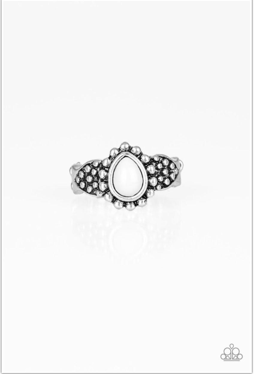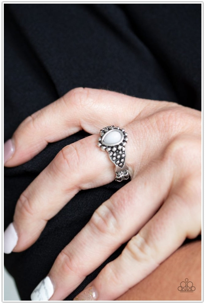 A teardrop gray bead is pressed into the center of a dainty silver band radiating with studded patterns for a seasonal look. Features a dainty stretchy band for a flexible fit.