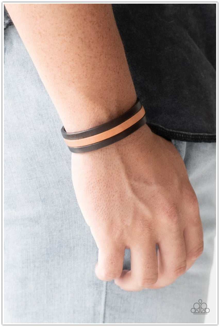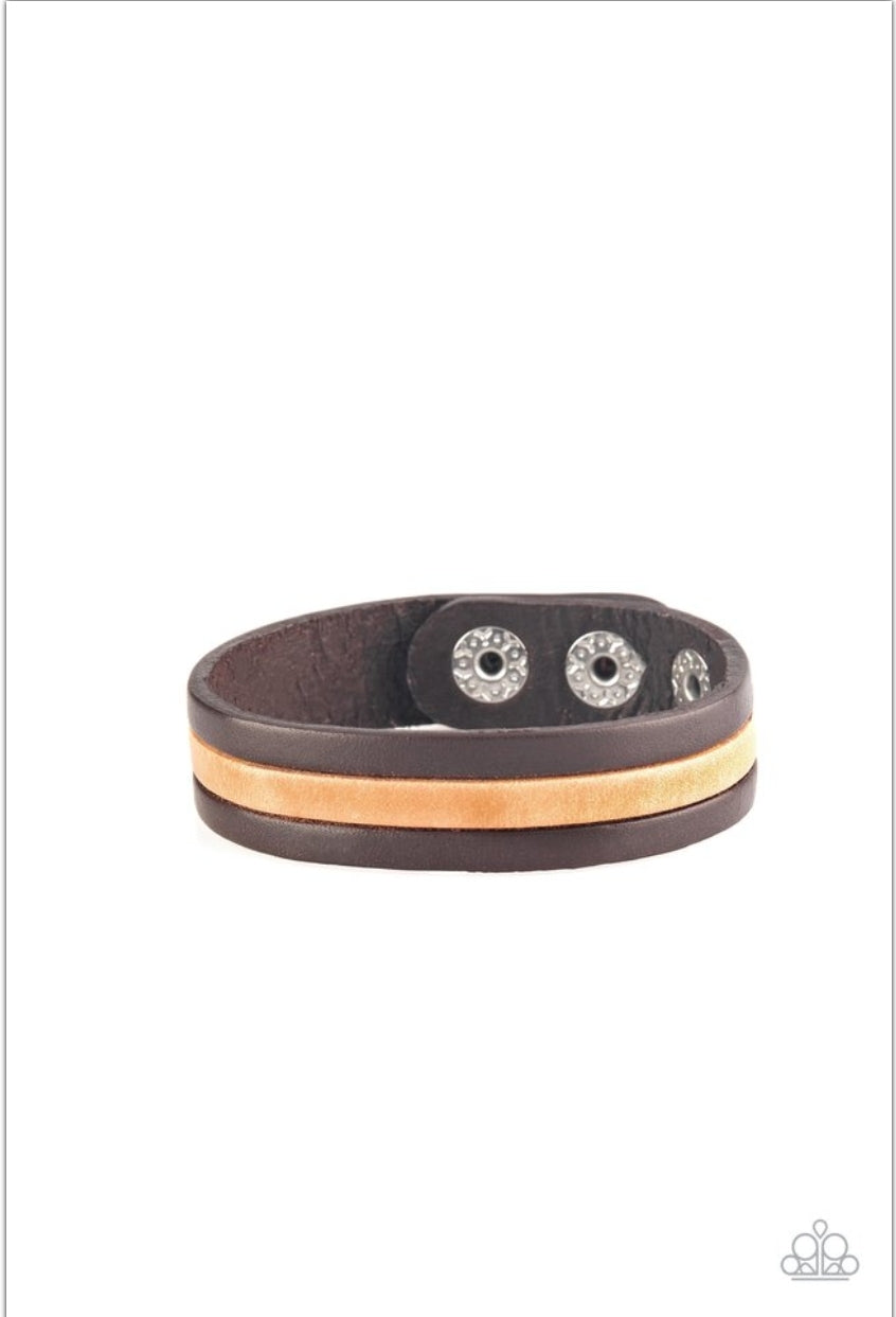 Strips of tan and brown leather strands coalesce into a single band around the wrist for a rustic look. Features an adjustable snap closure.