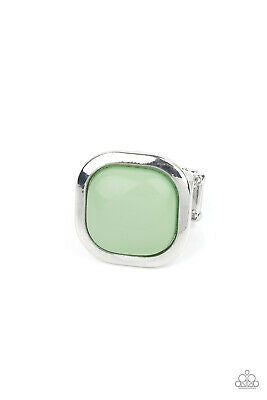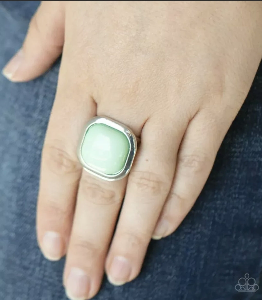 Square green face ring with a stretchy band.