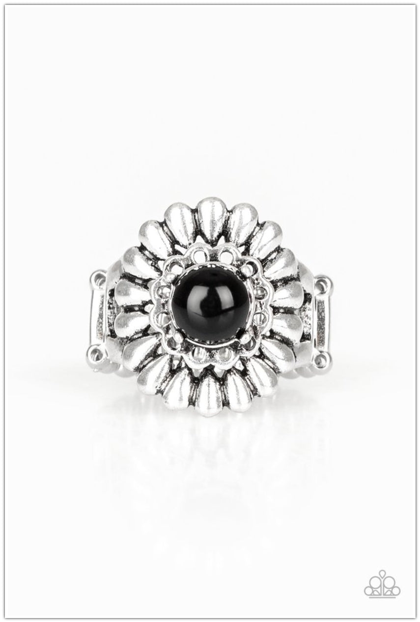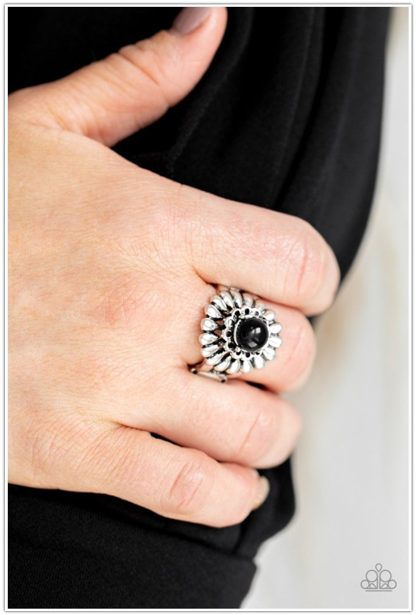 A shiny black bead is nestled atop a stacked floral frame, creating a colorful flower atop the finger. Features a stretchy band for a flexible fit.