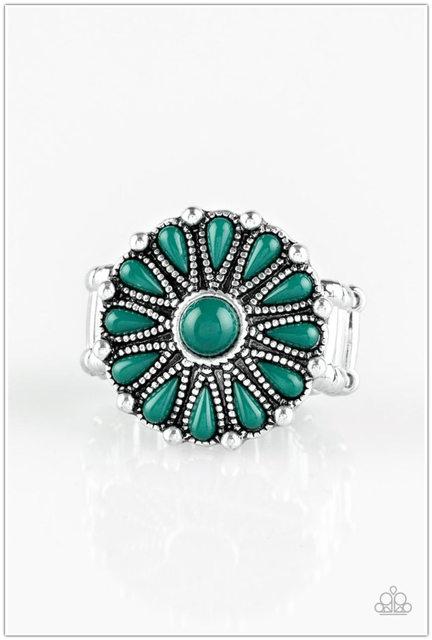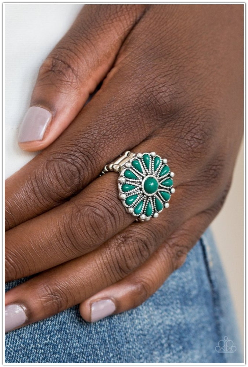 Refreshing green beads spin around a studded silver frame, creating a colorful floral pattern atop the finger. Features a stretchy band for a flexible fit.