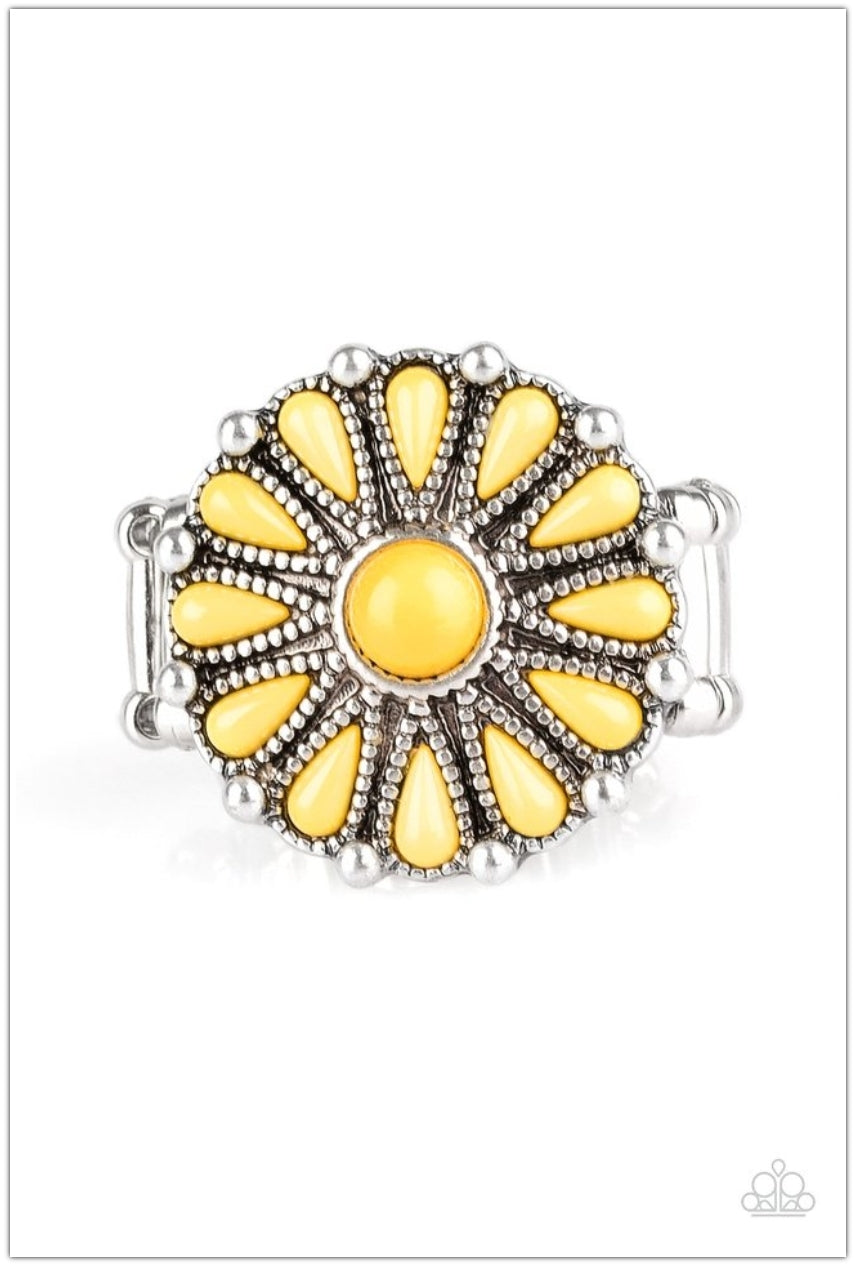 Sunny yellow beads spin around a studded silver frame, creating a colorful floral pattern atop the finger. Features a stretchy band for a flexible fit.