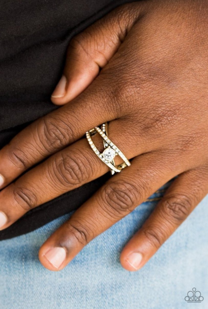 Encrusted in glittery white rhinestones, shiny brass bars crisscross across the finger. A sparkling white rhinestone adorns the center of the bands, creating a dazzling centerpiece. Features a stretchy band for a flexible fit.