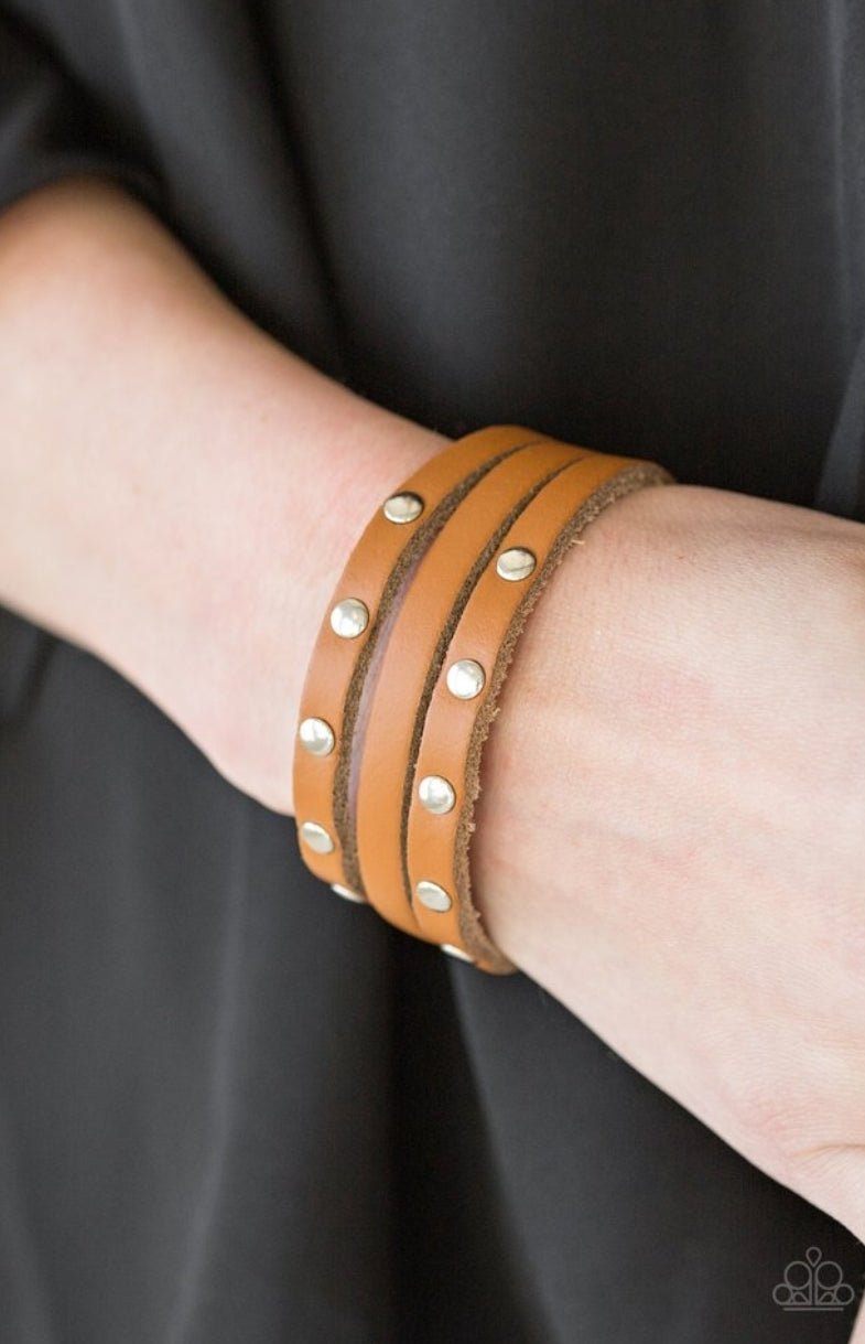 A shiny brown leather band is spliced into three strands. Flat silver beads are studded down the outer strands, adding a rugged finish to the urban palette. Features an adjustable snap closure.