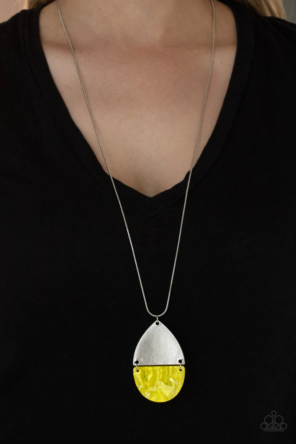 An Illuminating shell-like half moon frame links to a shiny silver triangular plate at the bottom of a lengthened silver snake chain, creating a summery pendant. Features an adjustable clasp closure.