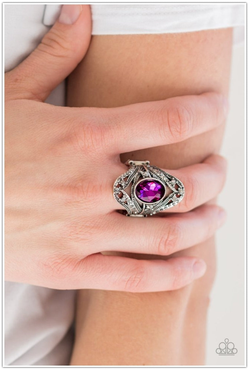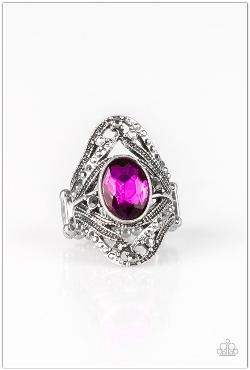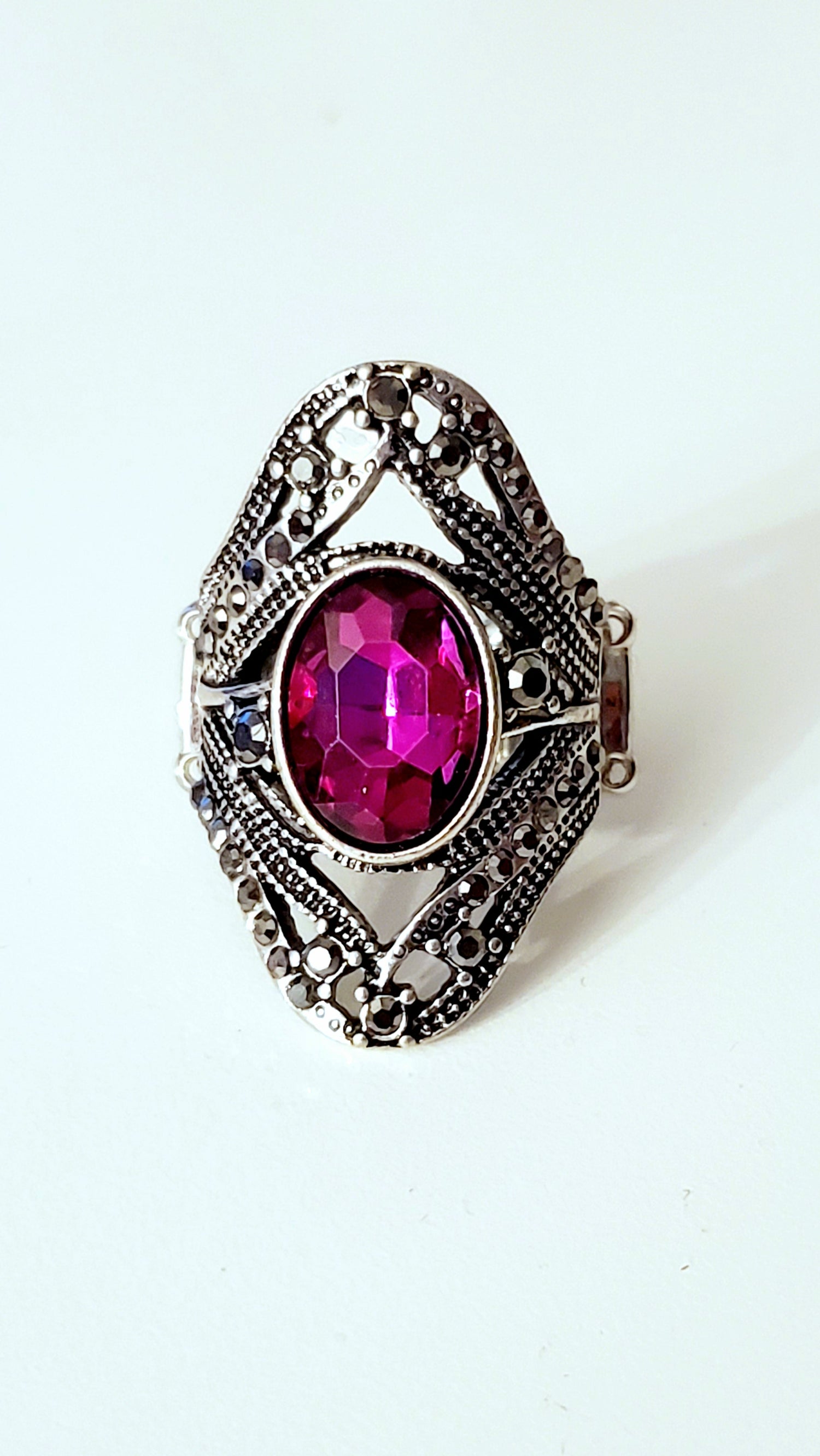 Radiating with dainty hematite rhinestones, studded silver bands whirl across the finger, coalescing into an ornate frame. An oversized pink rhinestone is pressed into the center of the band for a dramatic finish. Features a stretchy band for a flexible fit.