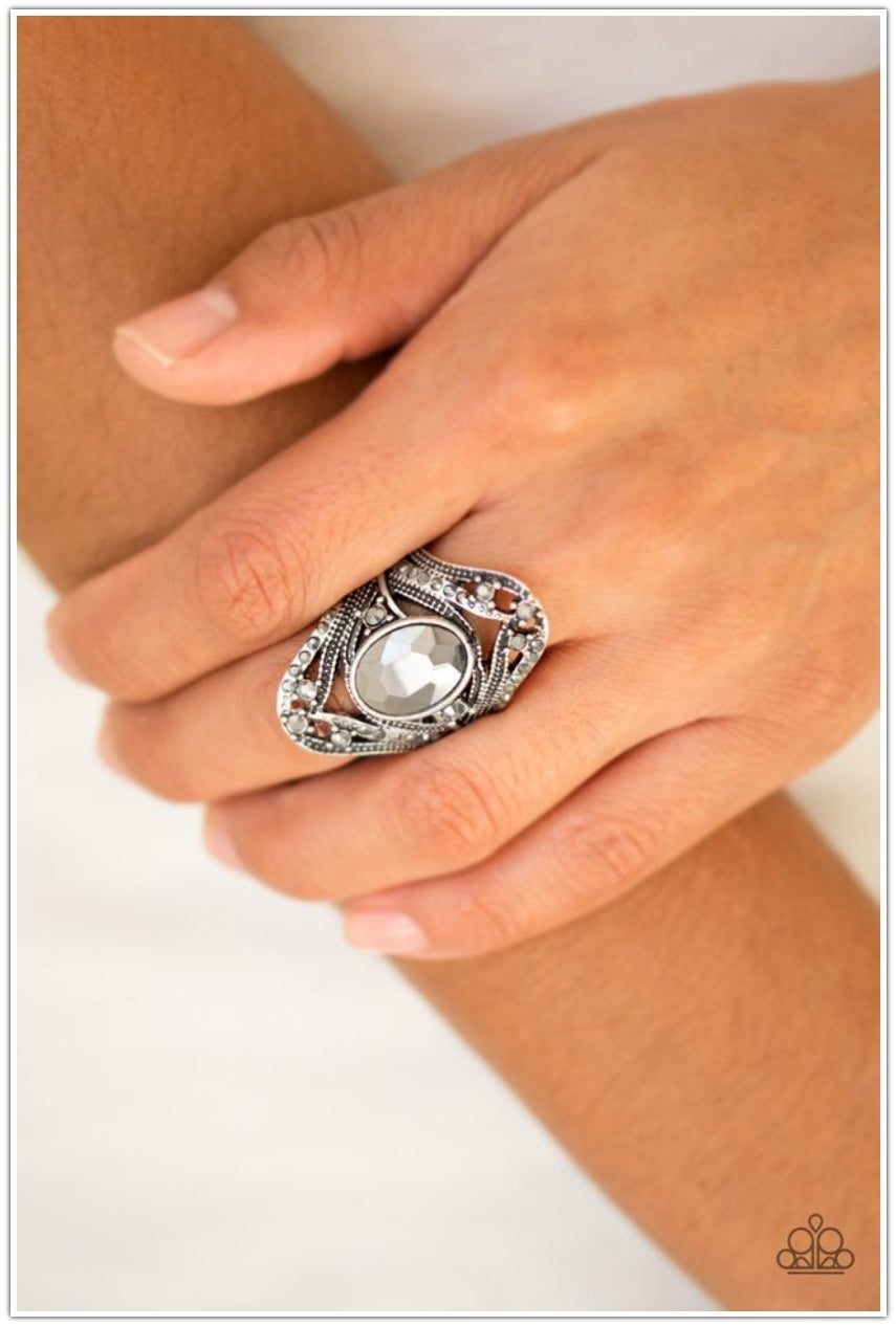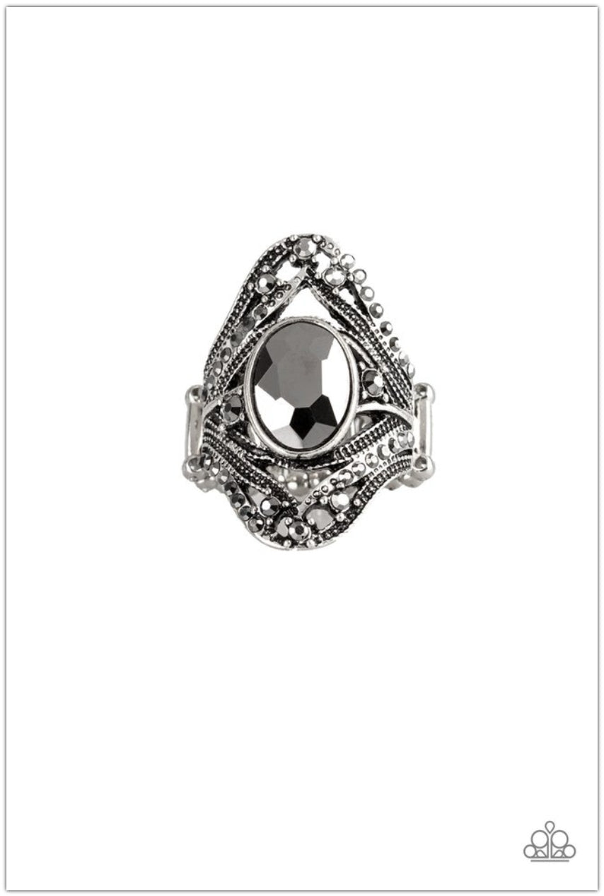 Radiating with dainty hematite rhinestones, studded silver bands whirl across the finger, coalescing into an ornate frame. An oversized hematite rhinestone is pressed into the center of the band for a dramatic finish. Features a stretchy band for a flexible fit.
