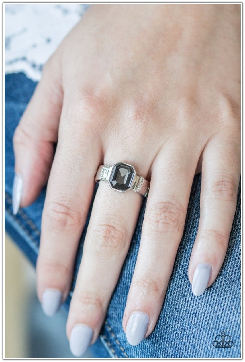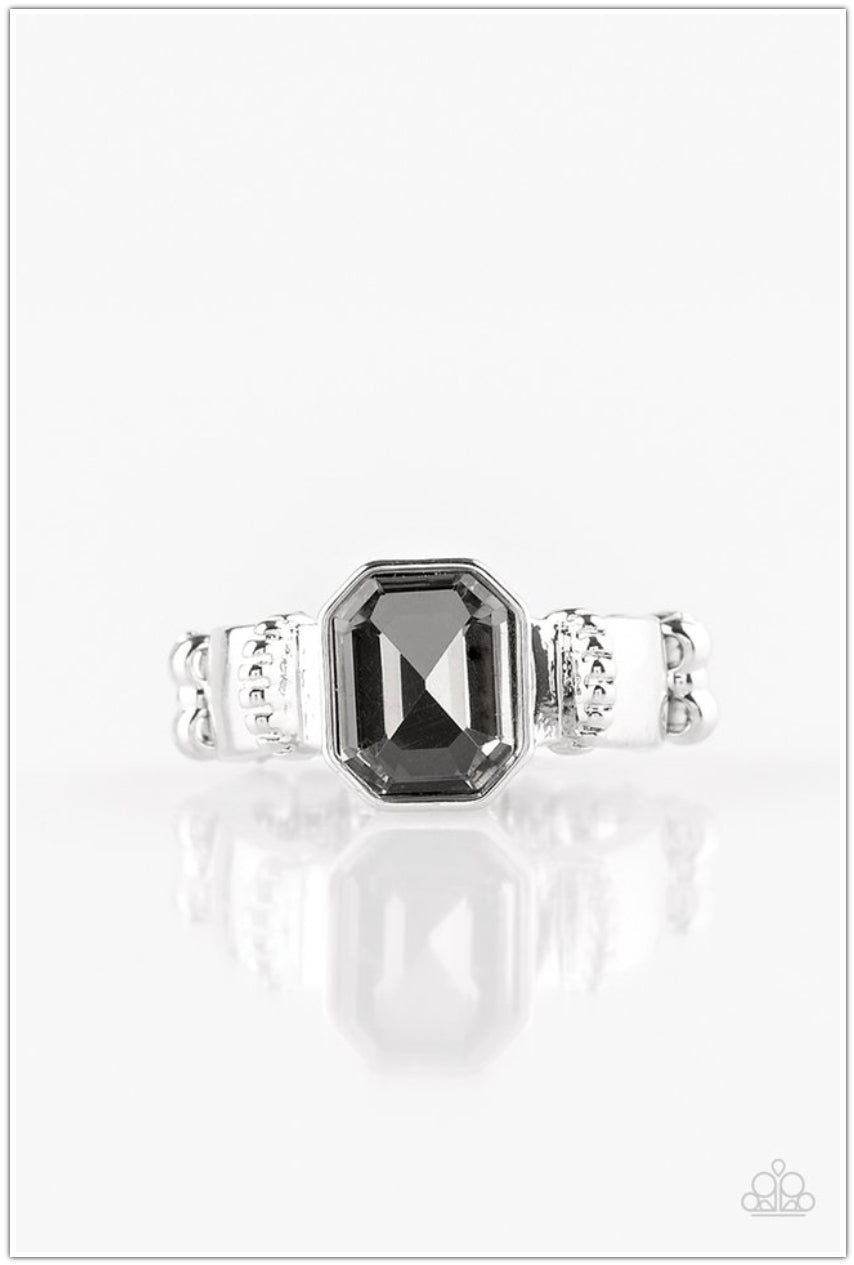 Featuring a regal emerald style cut, a smoky gem is pressed into the center of a dotted silver band for a romantic look. Features a dainty stretchy band for a flexible fit.