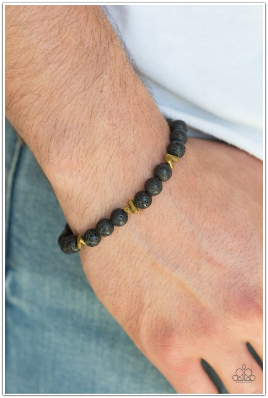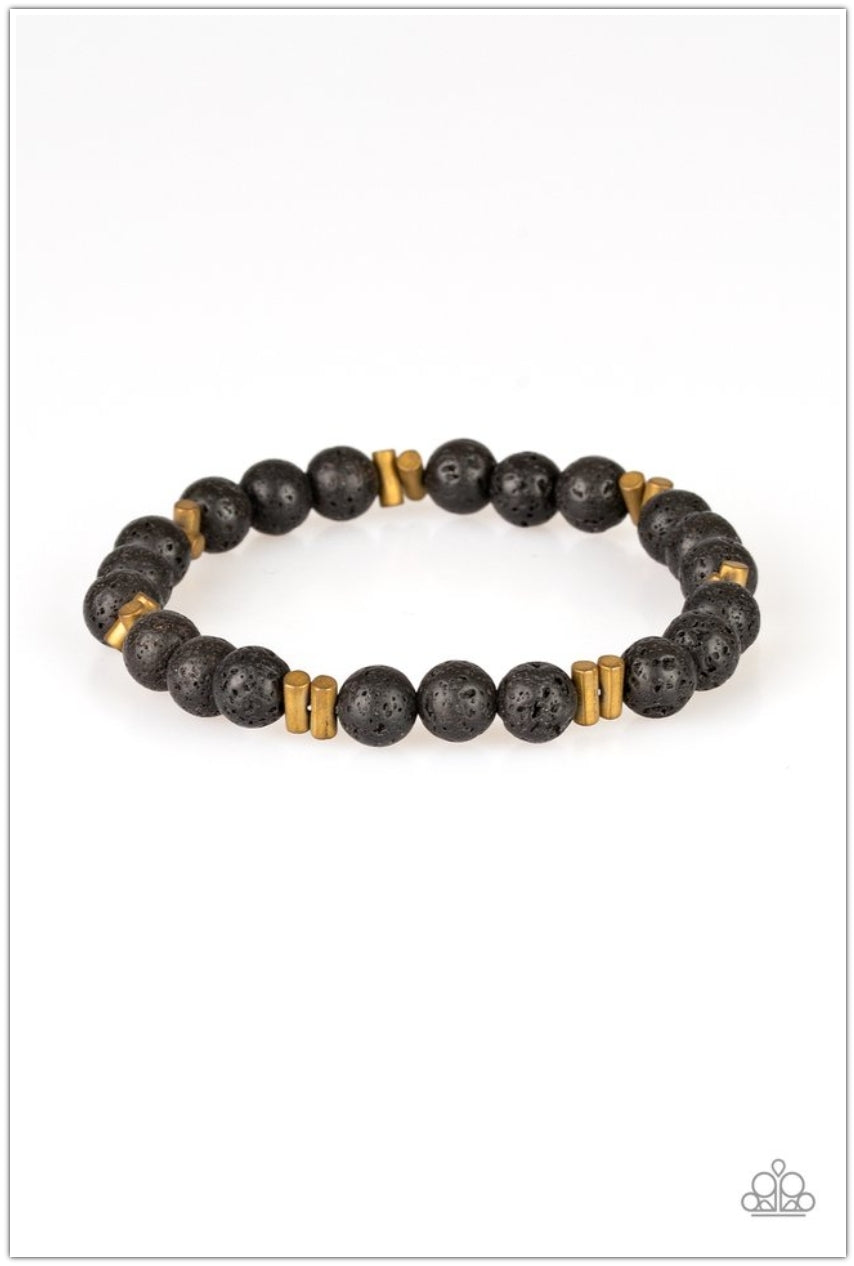 An earthy collection of brassy metallic accents and black lava beads are threaded along a stretchy band around the wrist for a seasonal look.