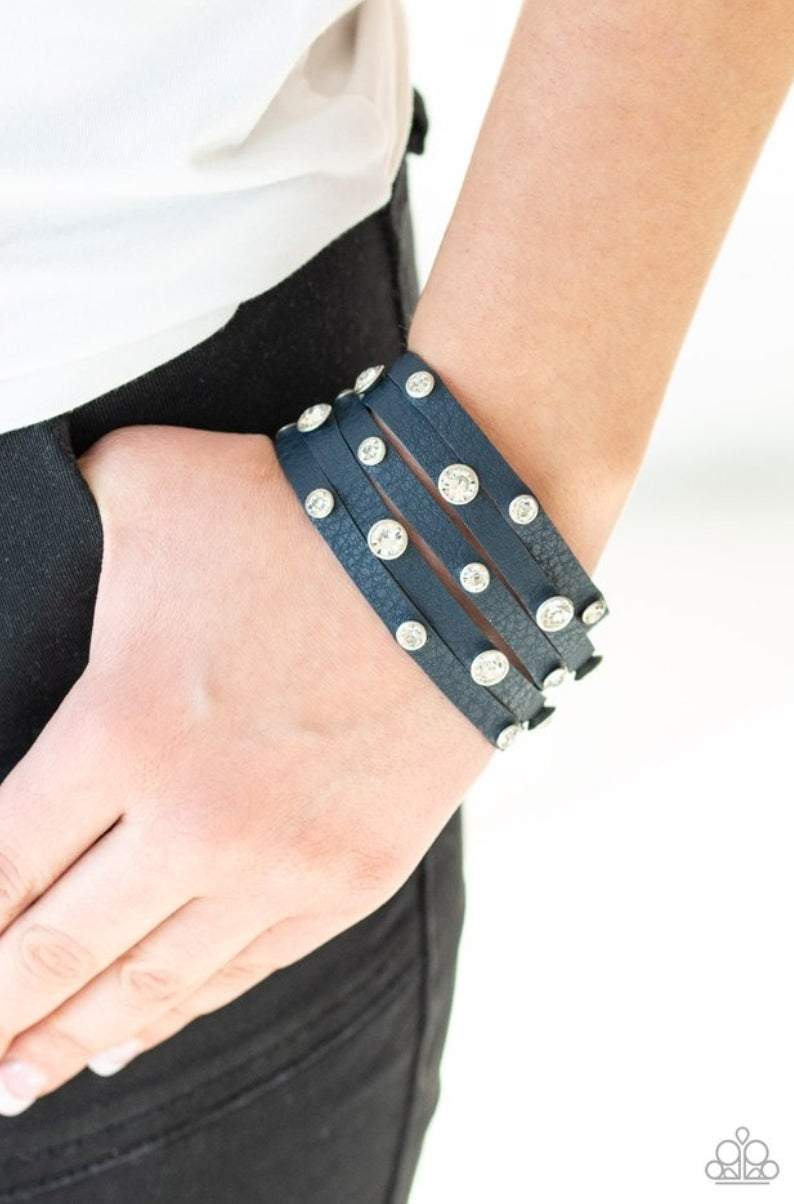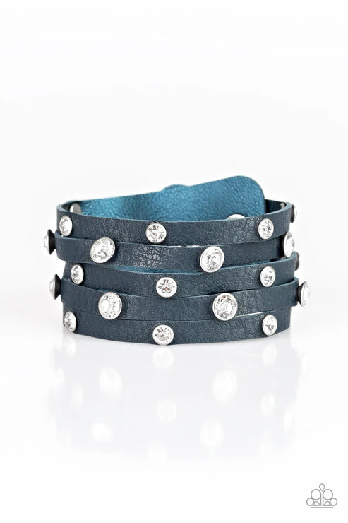 Dotted with glassy white rhinestones, a thick blue leather band has been spliced into five glittery strands around the wrist for a sassy look. Features an adjustable snap closure.