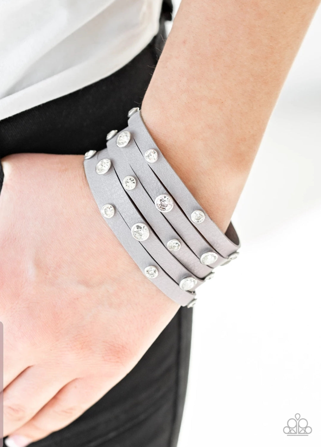 Dotted with glassy white rhinestones, a thick gray leather band has been spliced into five glittery strands around the wrist for a sassy look. Features an adjustable snap closure.