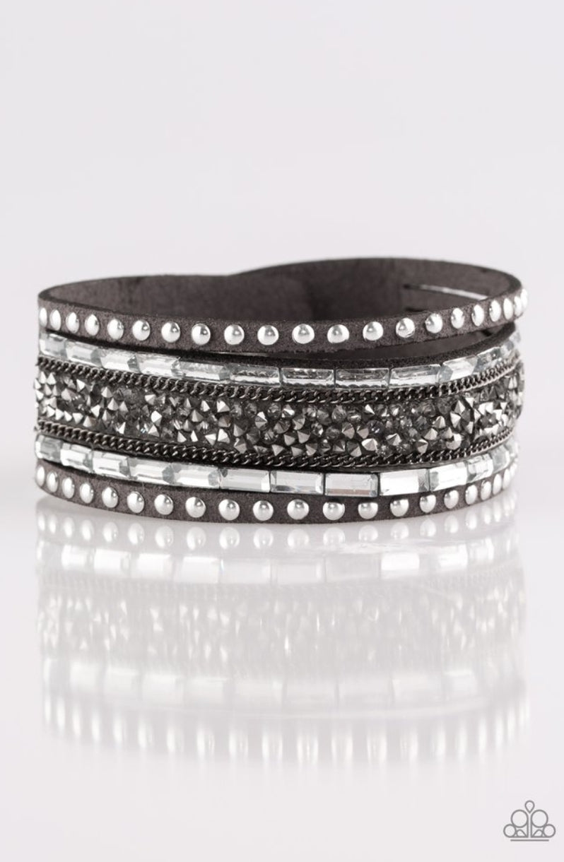 Featuring edgy emerald and prism style cuts, glassy white, smoky, and hematite rhinestones are encrusted down the center of a gray suede band that has been spliced into three. Shiny silver studs and glistening gunmetal chains are added for a sassy industrial finish. Features an adjustable clasp closure.