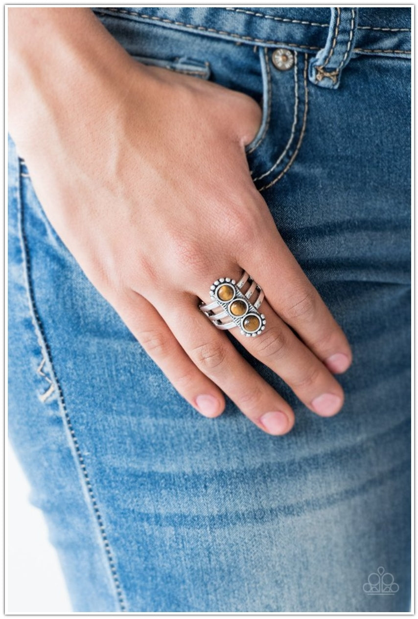 Infused with glassy tiger's eye stones, a studded silver frame is pressed into the center of a layered silver band for a seasonal look. Features a stretchy band for a flexible fit.