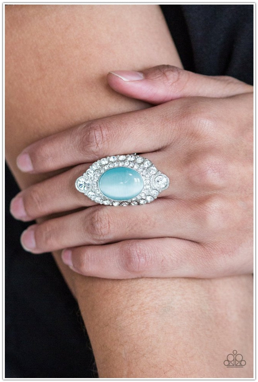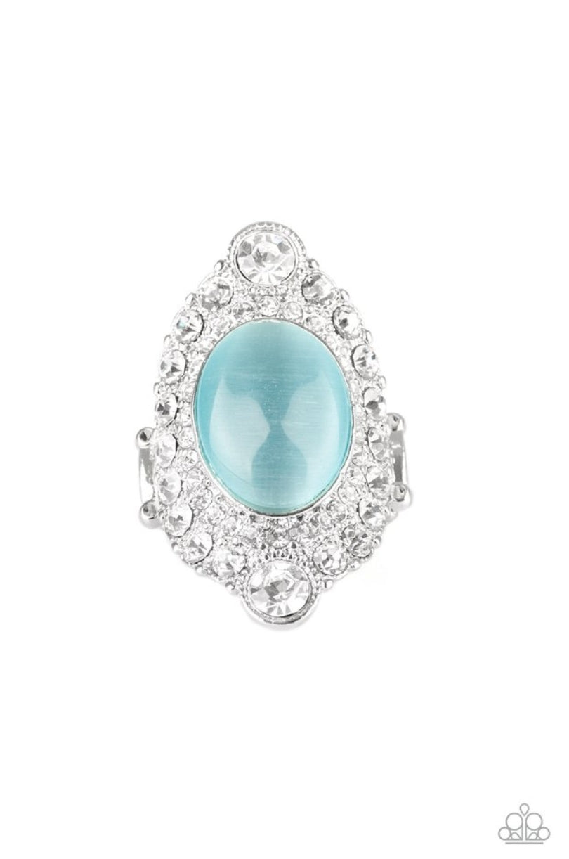 A glowing blue moonstone is pressed into a dramatic silver band radiating with glassy white rhinestones for a glamorous flair. Features a stretchy band for a flexible fit.