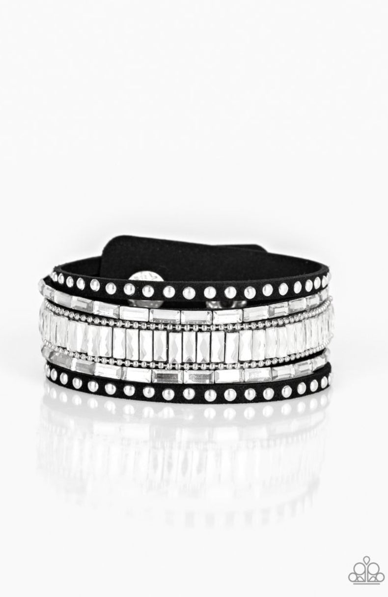 Shiny silver studs, dainty silver ball chains, and edgy white emerald-cut rhinestones race along a spliced black suede band for a rock star look. Features an adjustable snap closure.