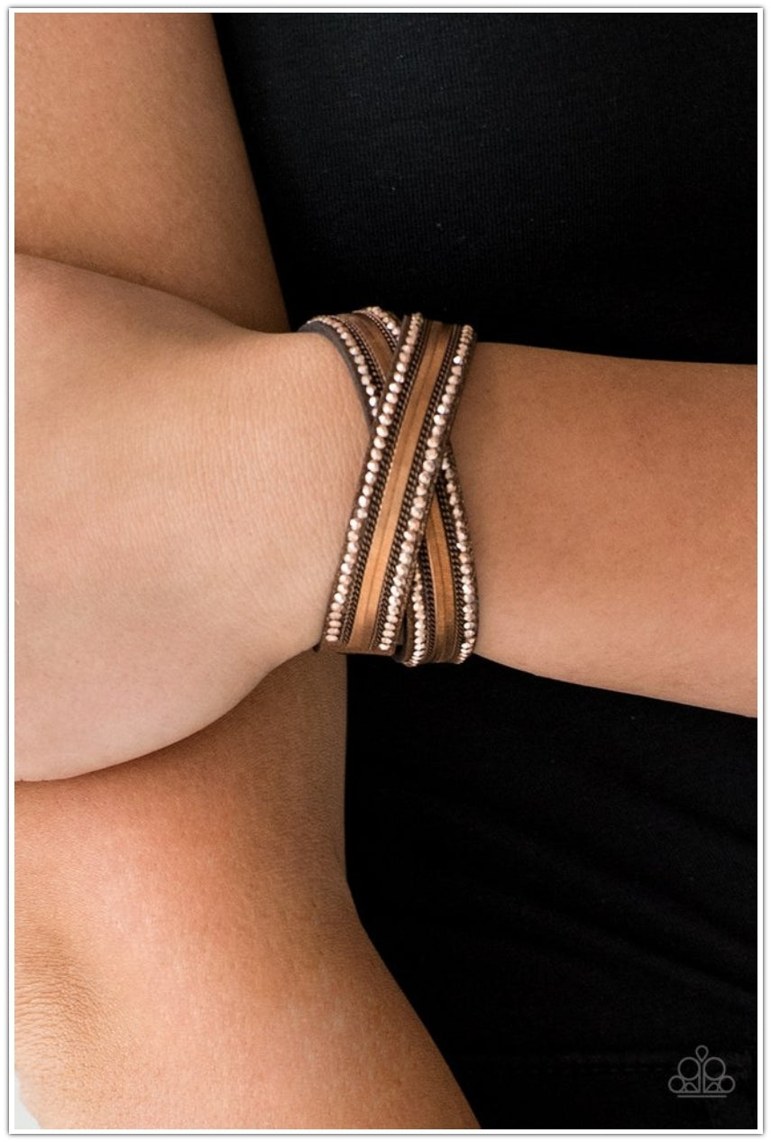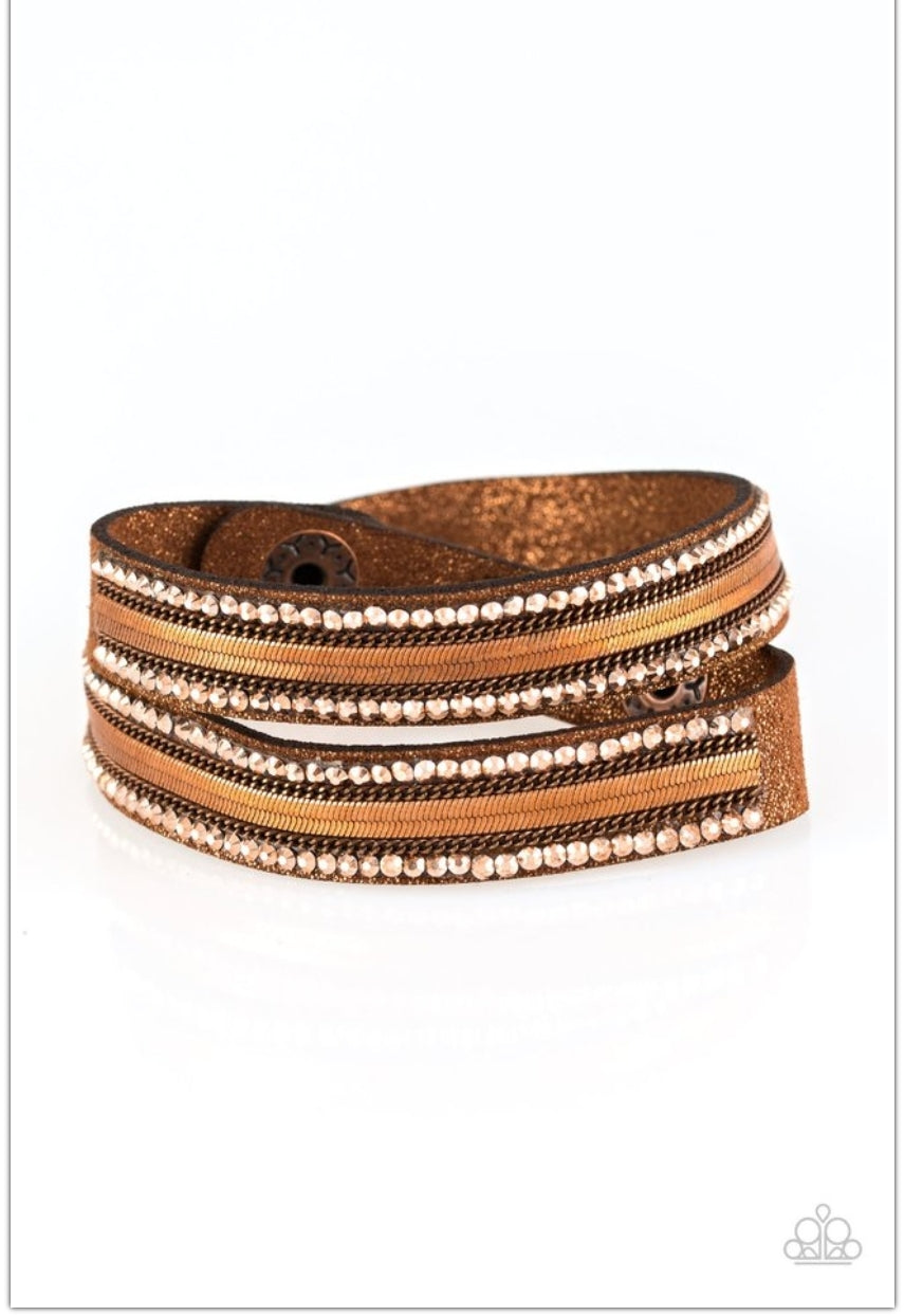 Rows of classic copper chain, flat copper chain, and dainty metallic rhinestones are encrusted along a brown suede band dusted in golden sparkles for a sassy look. The elongated band allows for a trendy double wrap design. Features an adjustable snap closure.