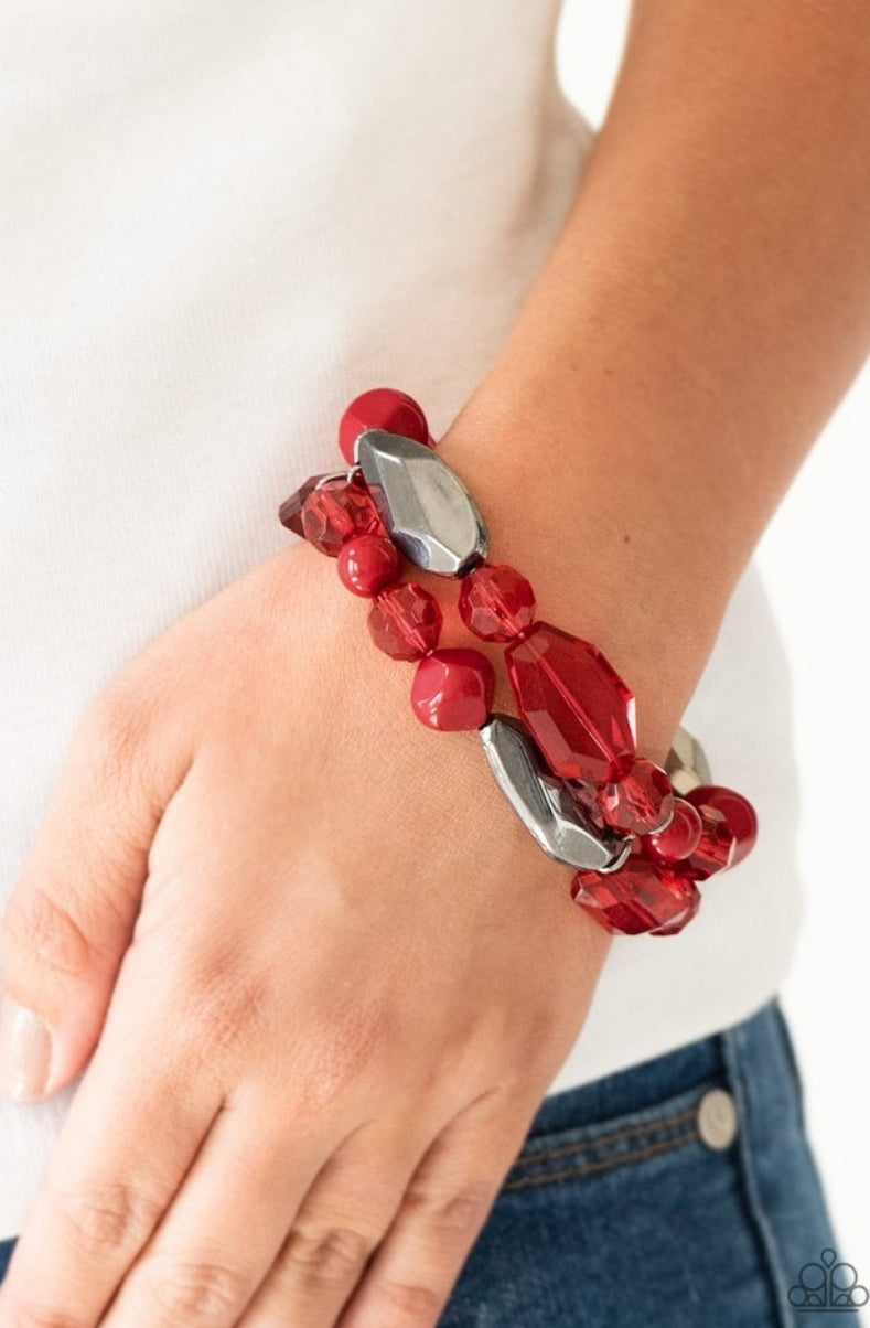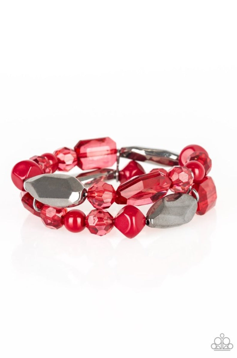 Mismatched gunmetal, polished red, and crystal-like beads are threaded along interlocking stretchy bands for a whimsical look.