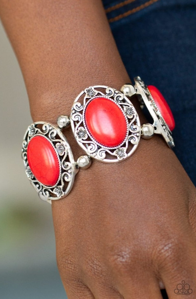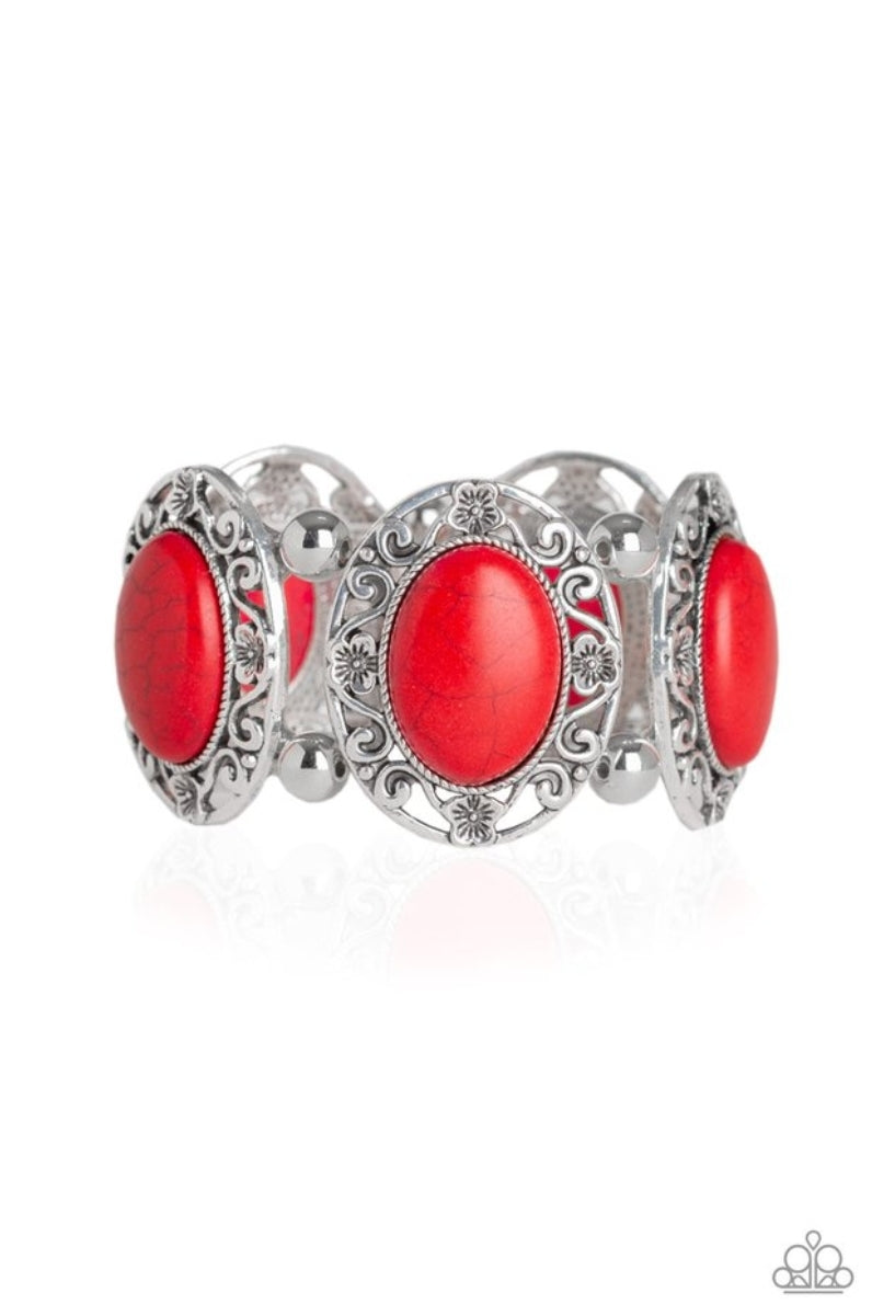 Featuring fiery red stone centers, a collection of shimmery silver floral frames are threaded along a stretchy band around the wrist for a seasonal flair.