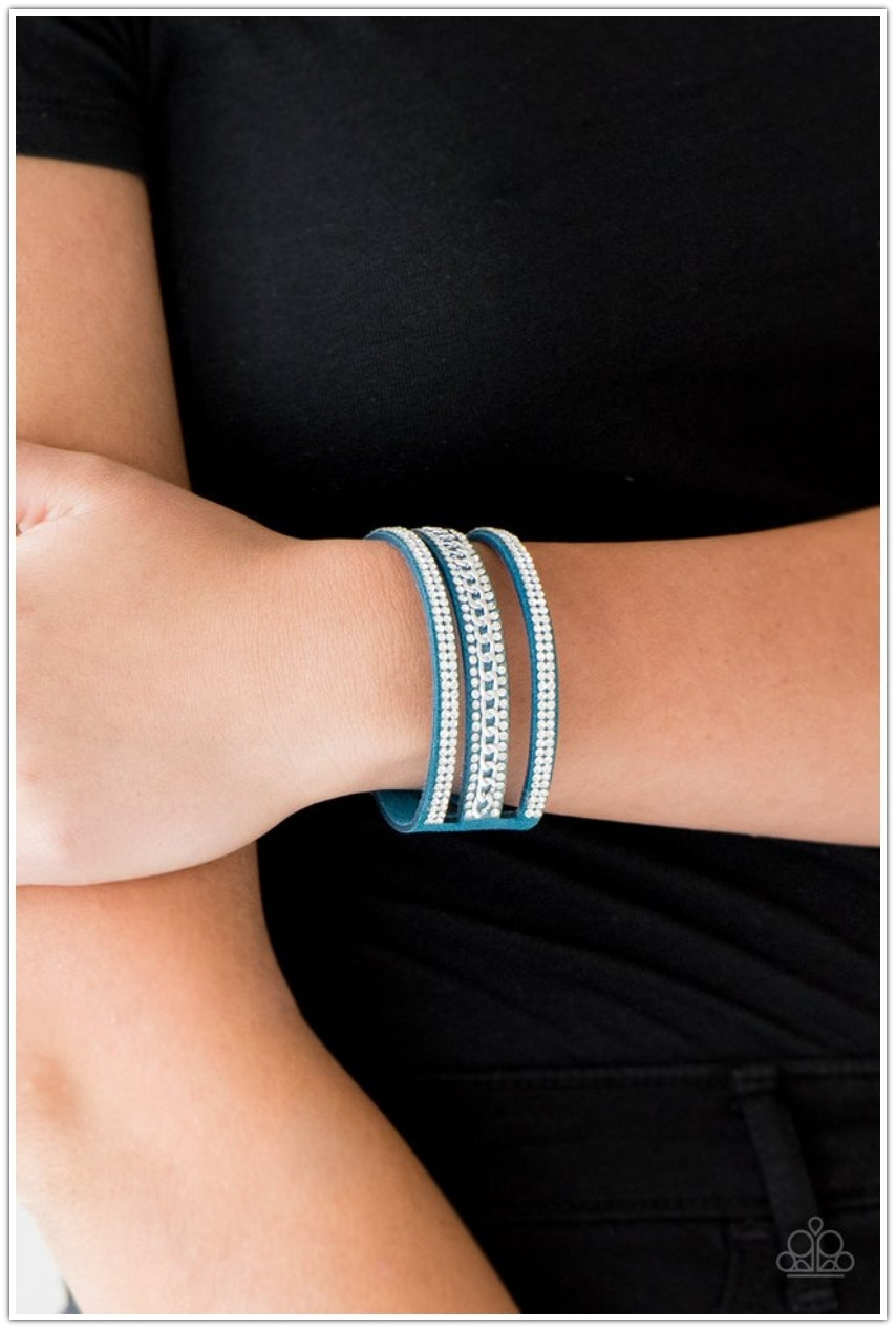 Rows of glassy white rhinestones and a shimmery silver chain are encrusted along blue suede bands for a sassy look. Features an adjustable snap closure.