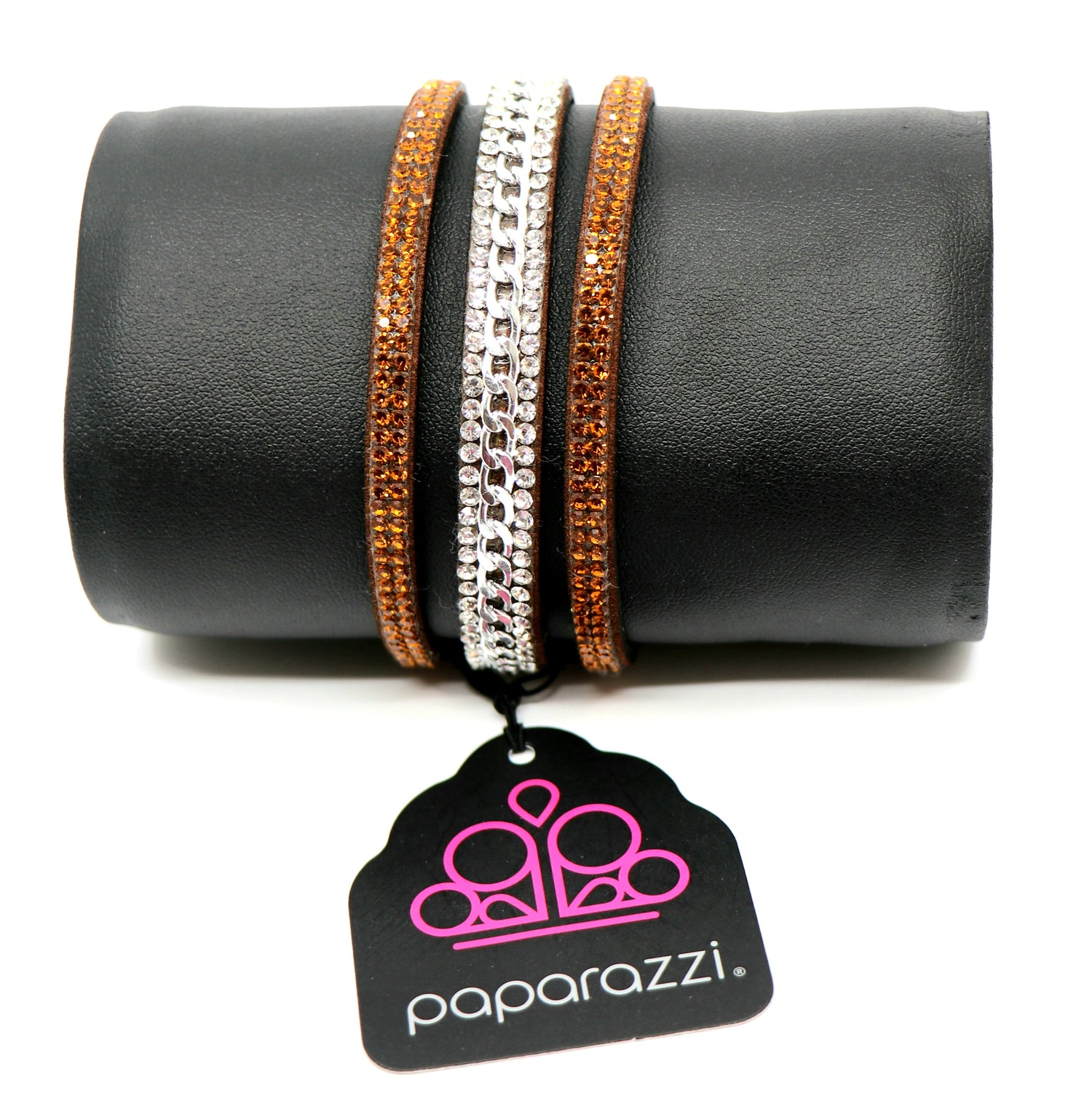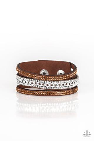 Rows of glassy topaz and white rhinestones and a shimmery silver chain are encrusted along brown suede bands for a sassy look. Features an adjustable snap closure.