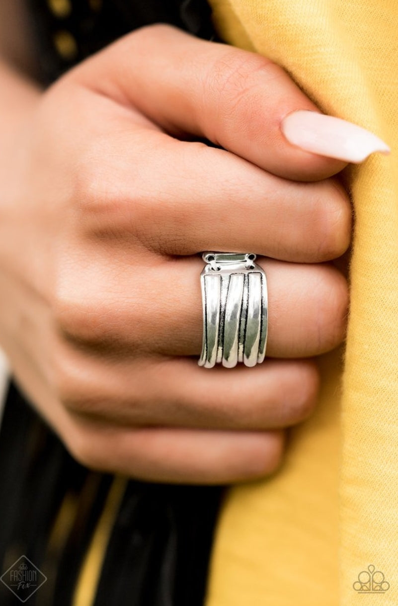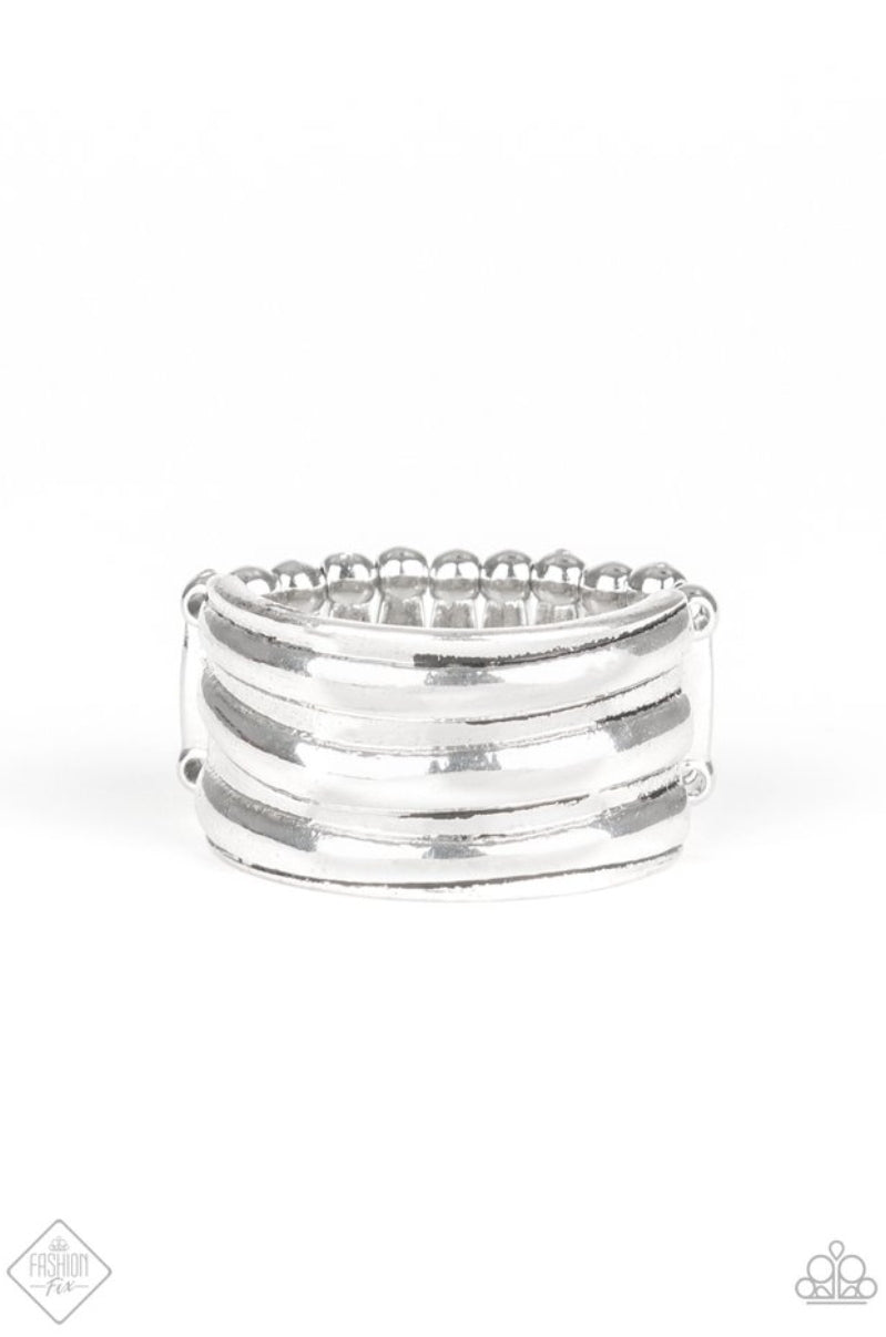 Brushed in a high-sheen finish, ribbed silver bands stack across the finger for an edgy industrial look. Features a stretchy band for a flexible fit.