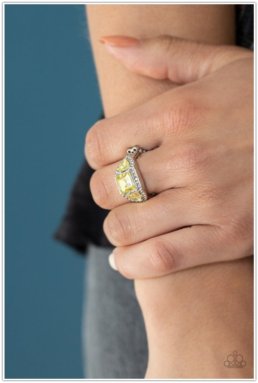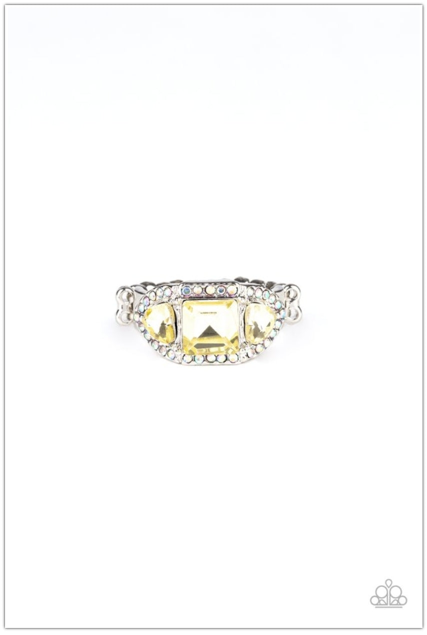 A square cut yellow rhinestone is flanked by two charming heart shaped yellow rhinestones atop a silver band dotted in dainty iridescent rhinestones. Features a dainty stretchy band for a flexible fit.