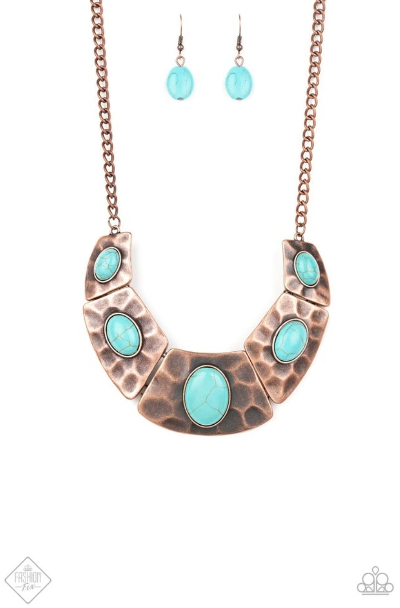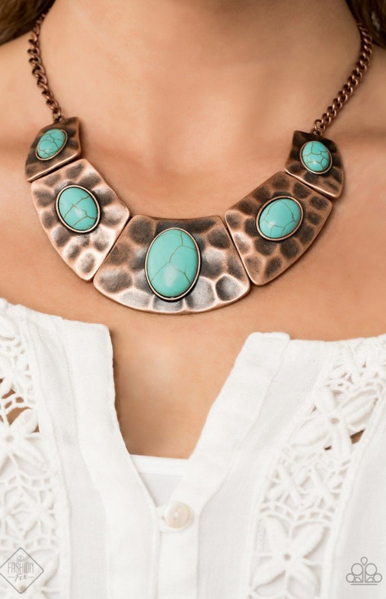 Dotted with refreshing turquoise stone accents, a collection of hammered copper plates link below the collar for an artisan inspired look. Features an adjustable clasp closure.