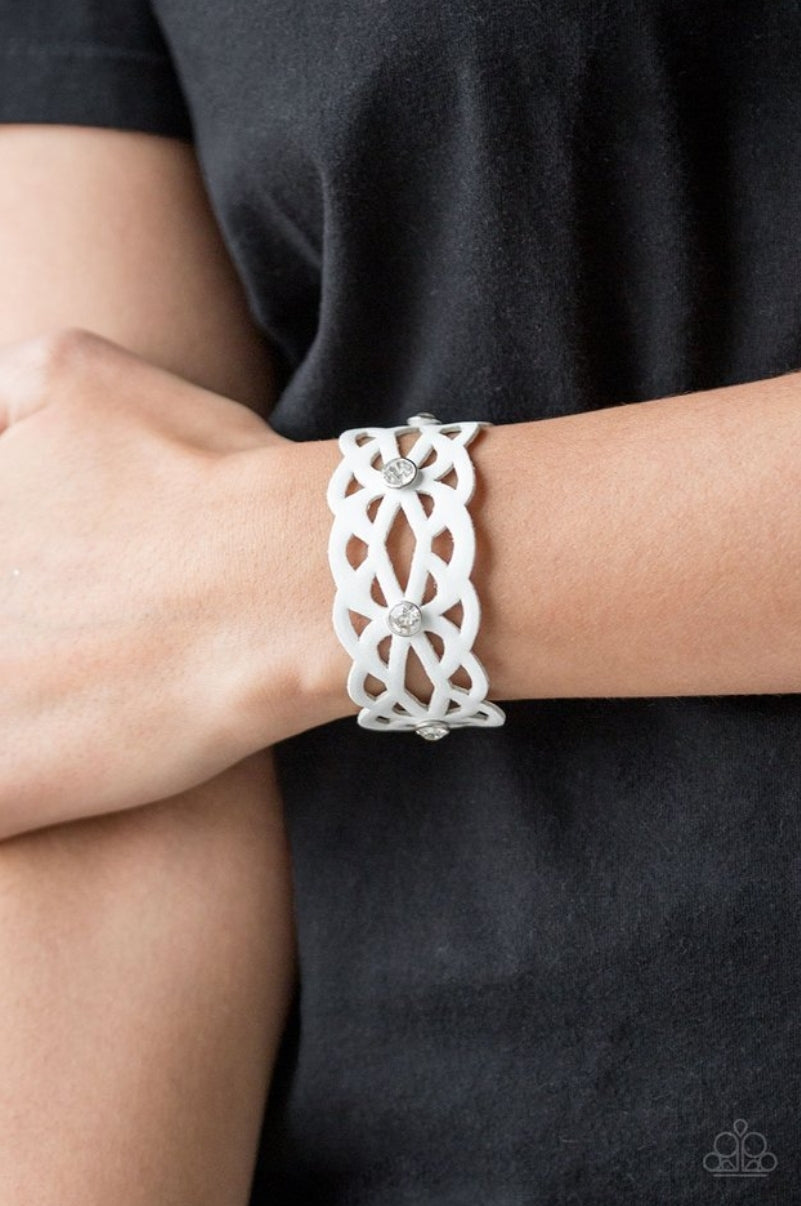 Dotted with glittery white rhinestones, a floral patterned leather band wraps around the wrist for a seasonal look. Features an adjustable snap closure.