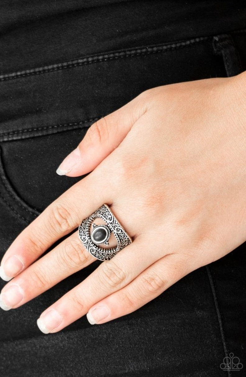 Embossed in shimmery filigree, glistening silver frames join around an earthy black stone center for a seasonal look. Features a stretchy band for a flexible fit.