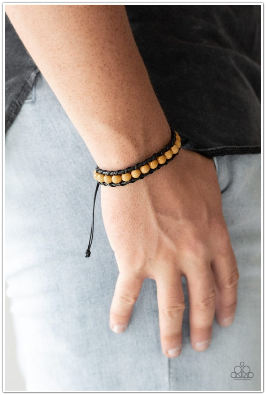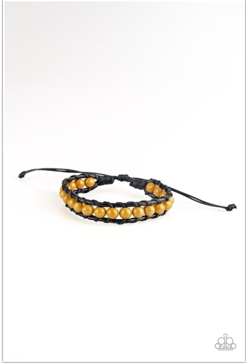 Earthy wooden beads are threaded along black shiny cording around the wrist for a seasonal look. Features an adjustable sliding knot closure.