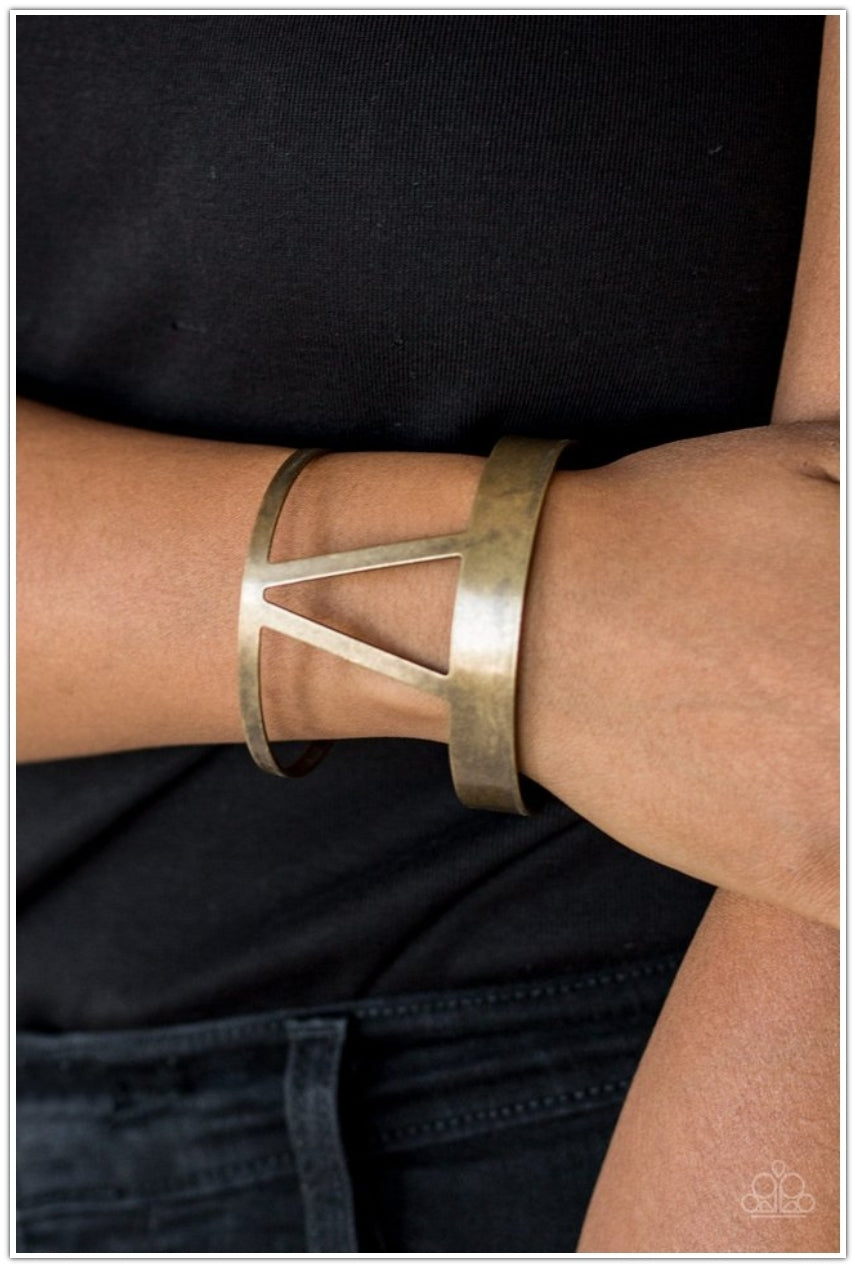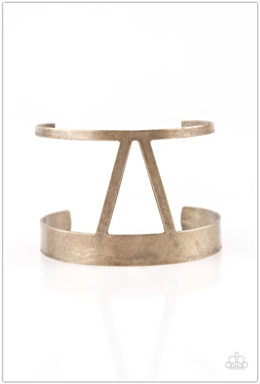 Brushed in an antiqued shimmer, an airy geometrical brass cuff wraps around the wrist for a tribal inspired look.