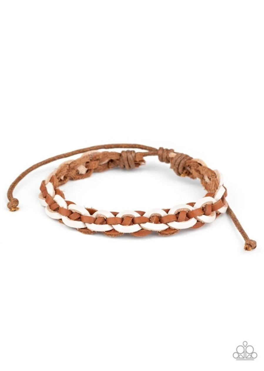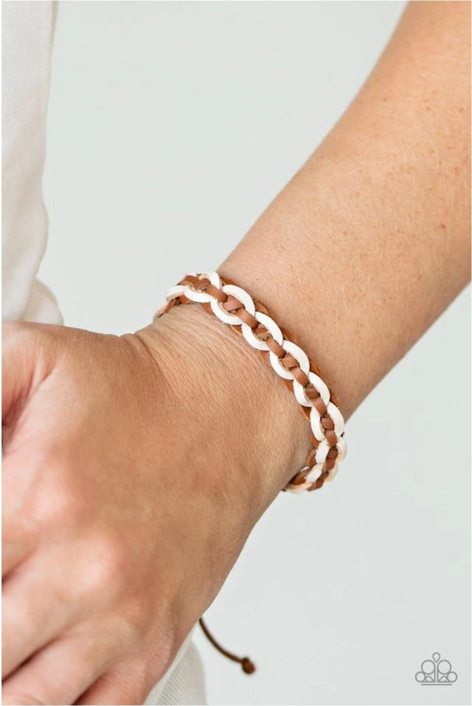 White and brown leather laces weave around the wrist, creating a rustic braid. Features an adjustable sliding knot closure.