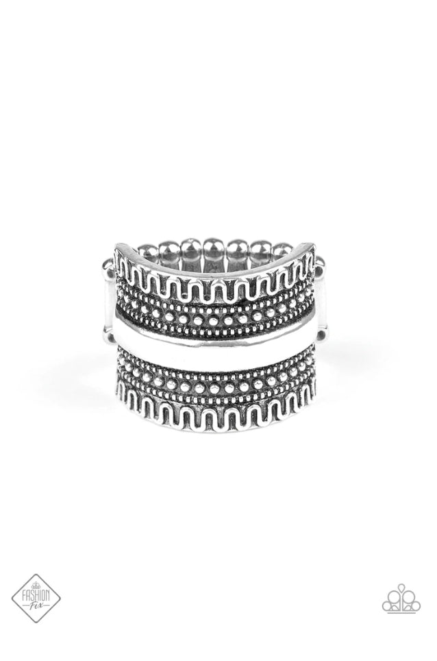 A smooth silver bar is flanked by rows of studded and winding textures, creating an unforgettable collision of texture that wraps boldly around the finger. Features a stretchy band for a flexible fit.