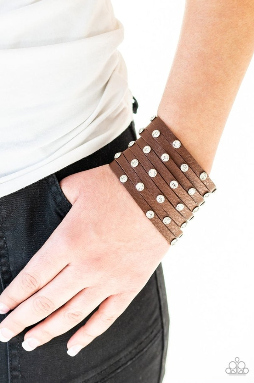 A thick brown leather band has been spliced into numerous brown strands. Featuring sleek silver frames, glittery white rhinestones are sprinkled across the leather bands for a sassy finish. Features an adjustable snap closure.