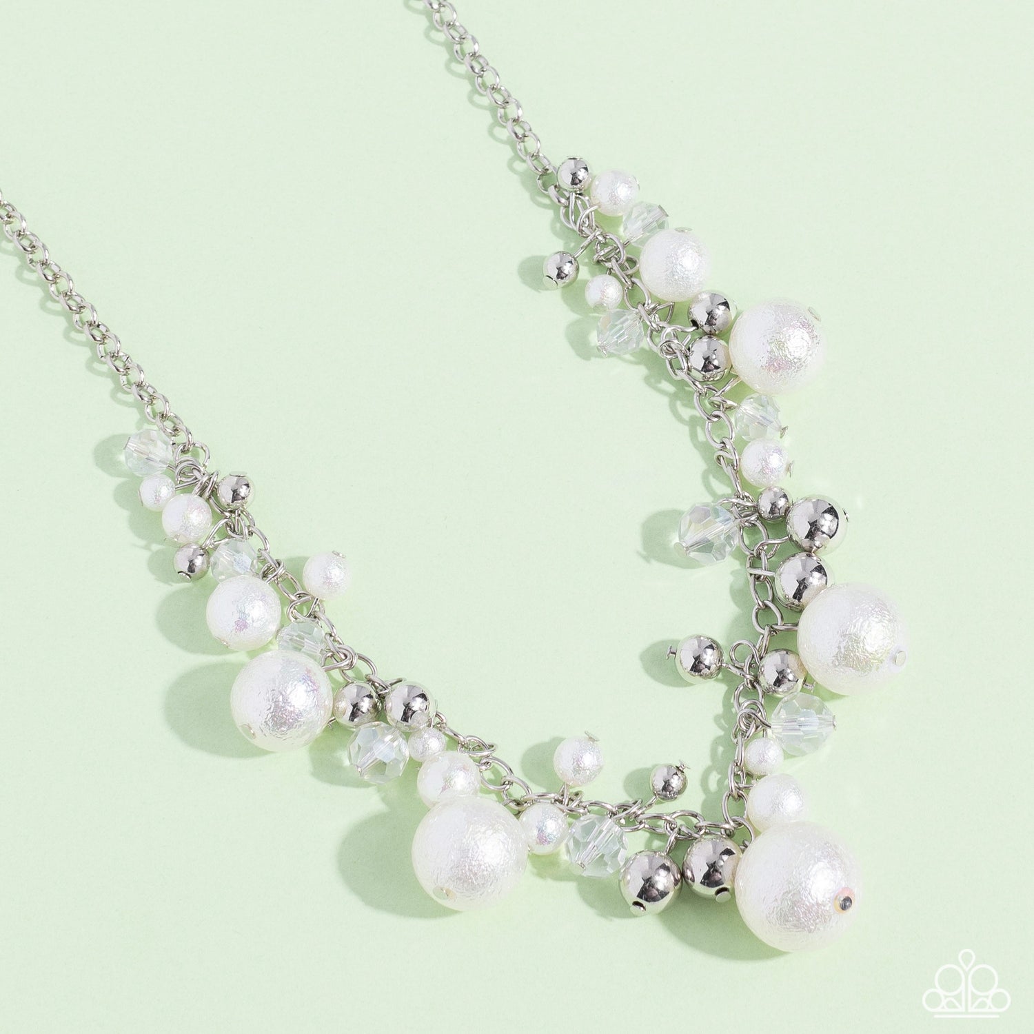 Featuring glassy and polished finishes, pristine white and silver beads cascade from the bottom of a classic silver chain, creating a gorgeous clustered fringe below the collar. Varying sizes of iridescent beads, featuring a subtle scratch surface, add a refined shimmer to the clustered display for a gorgeous effect. Features an adjustable clasp closure. Due to its prismatic palette, color may vary. Sold as one individual necklace. Includes one pair of matching earrings.