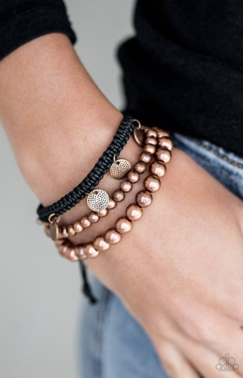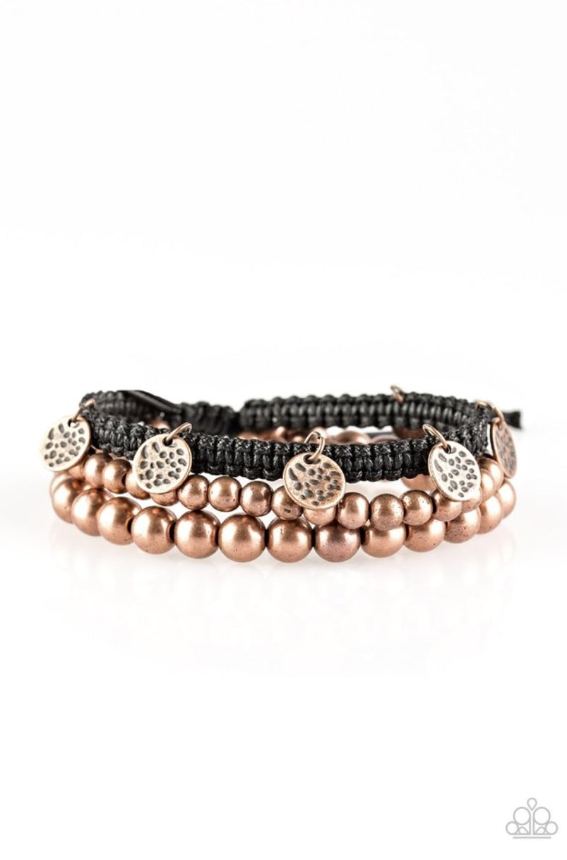 Brushed in a pearly finish, two strands of copper beads join a strand of braided black twine around the wrist. Delicately hammered in an antiqued shimmer, dainty copper discs swing from the wrist for a whimsical finish. Features an adjustable sliding knot closure.