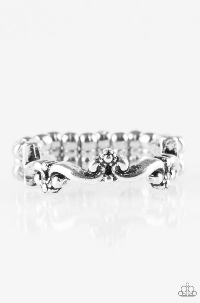 Floral silver filigree dances across the finger, creating a dainty band. Features a dainty stretchy band for a flexible fit.
