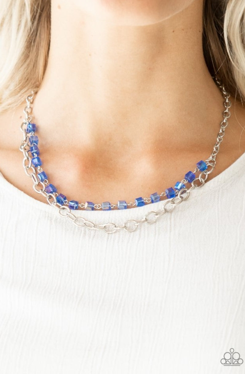 necklace: A strand of iridescent blue crystal-like cube beading joins a classic strand of silver chain below the collar, creating refined layers. Features an adjustable clasp closure.