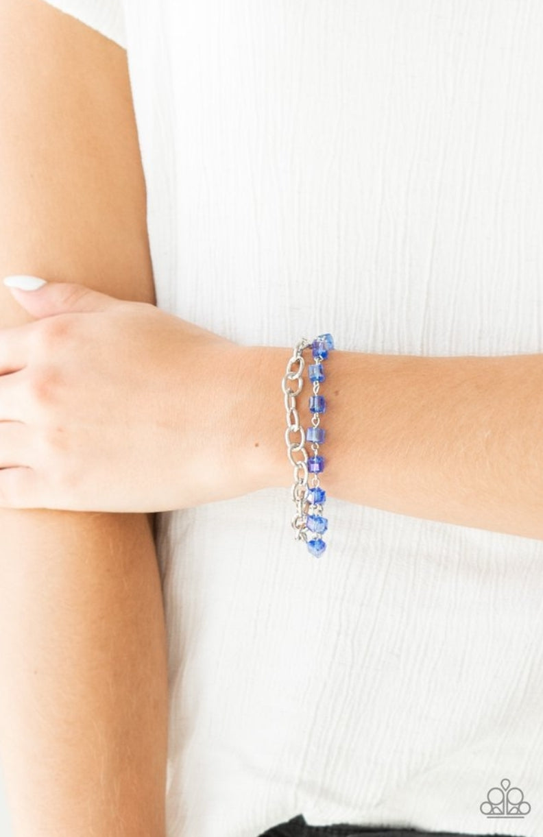 bracelet: A strand of iridescent blue crystal-like cube beading joins a classic strand of silver chain around the wrist, creating refined layers. Features an adjustable clasp closure.
