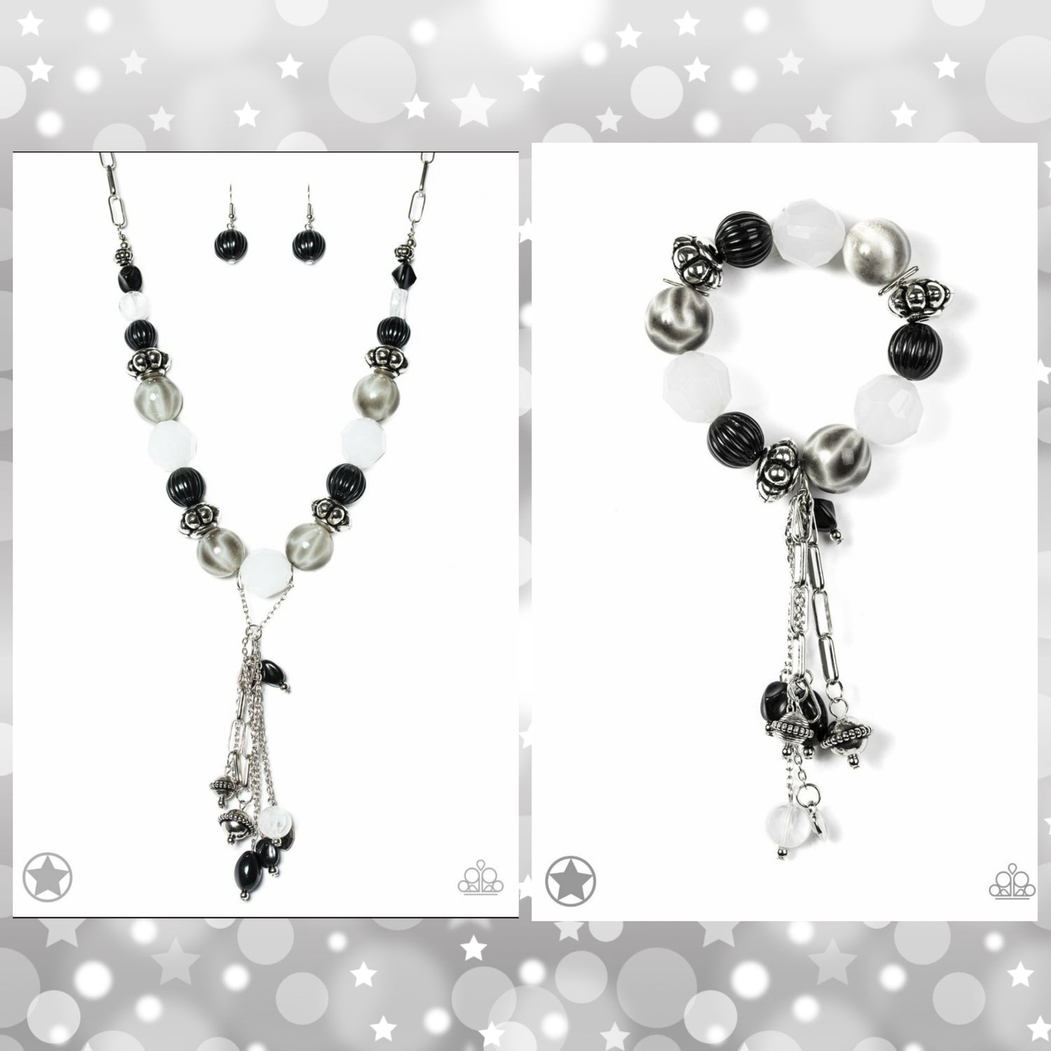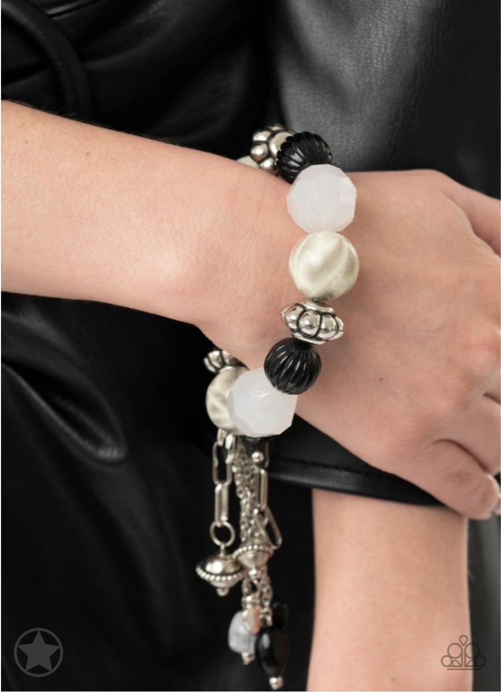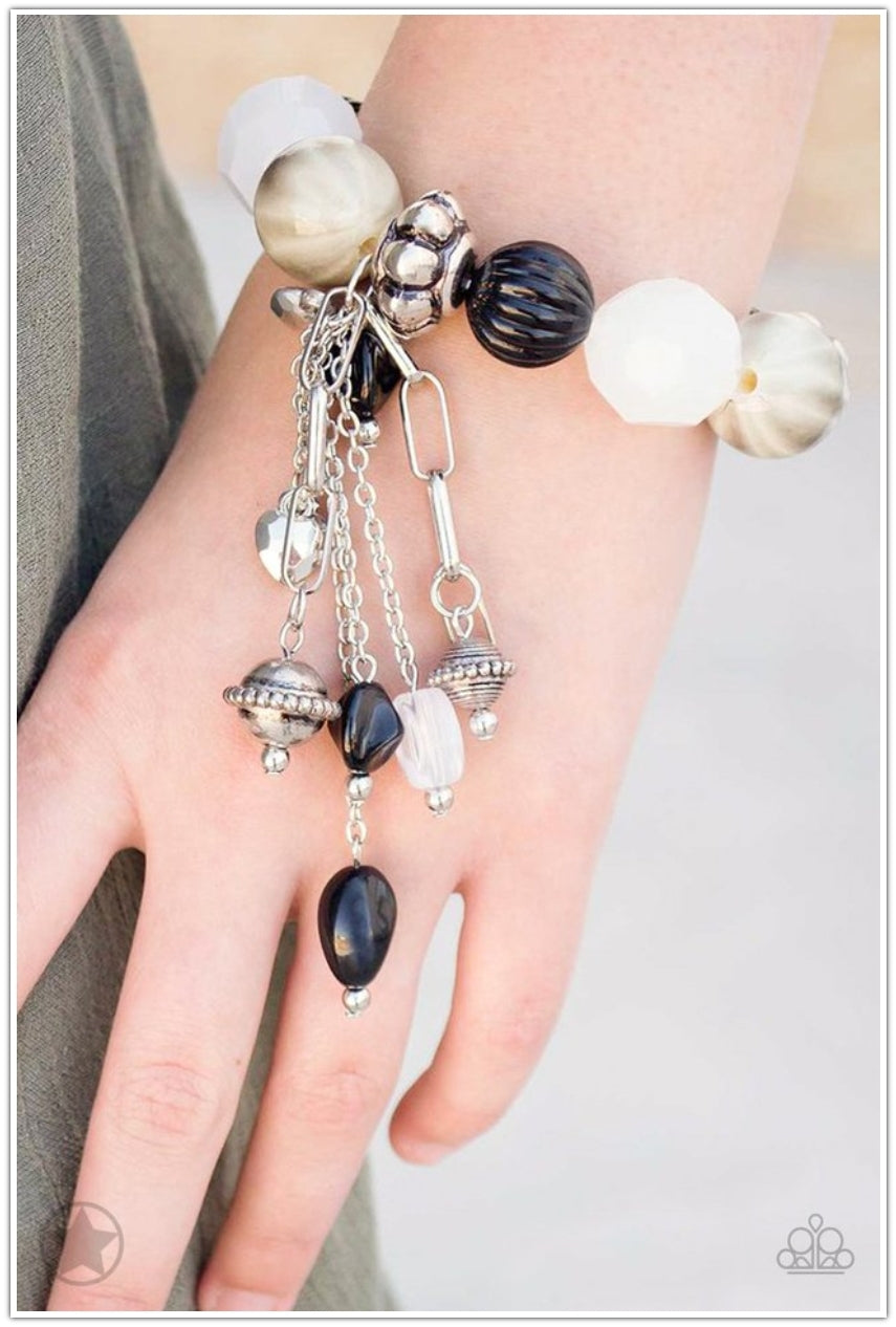 Bracelet: Dainty black beads nestled among beautiful silver and white pieces along a stretchy band. Dangling charms add a dramatic effect.