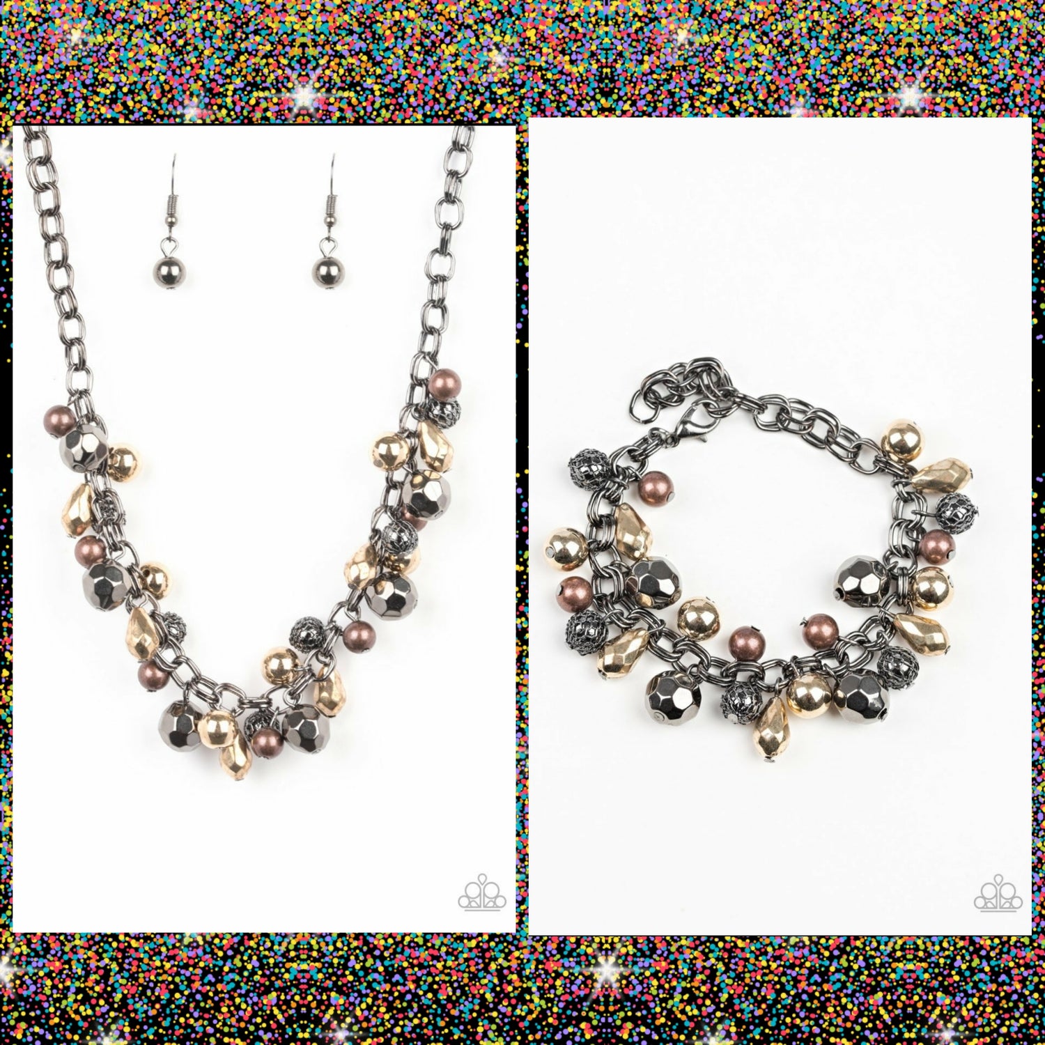 NECKLACE: Featuring shiny, faceted, and mesh finishes, mismatched copper, gold, and gunmetal beads trickle below the collar for an edgy industrial look. Features an adjustable clasp closure.