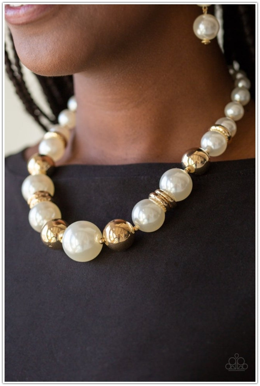 Necklace: Gradually increasing in size toward the center, dramatic white pearls and shiny gold beads drape below the collar for a refined look. Glistening gold accents are sprinkled between the classic beads, adding depth and shimmer to the bubbly palette. Features an adjustable clasp closure.