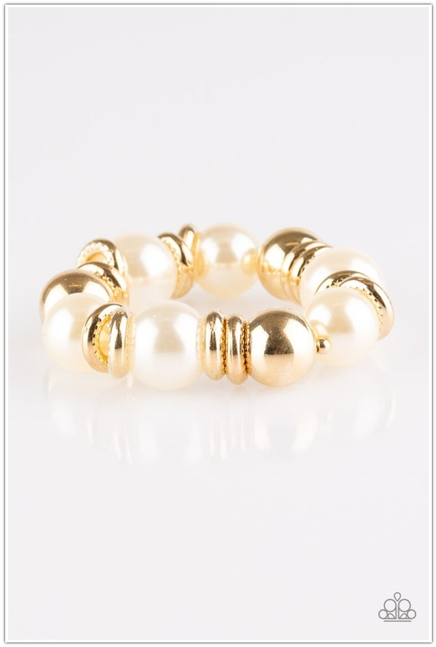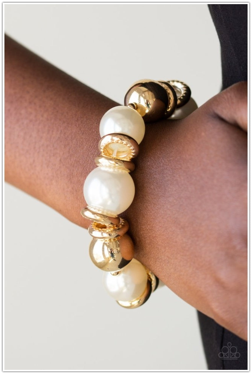 Bracelet: Dramatic white pearls and shiny gold beads are threaded along an elastic stretchy band around the wrist. Glistening gold accents are sprinkled between the classic beads, adding depth and shimmer to the bubbly palette. Features an adjustable clasp closure.