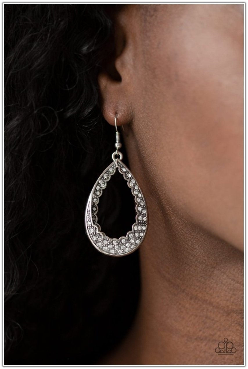 Earrings: Dotted with dainty silver studs, the inside and outside of a silver teardrop is encrusted in white rhinestones for a regal look. Earring attaches to standard fishhook fitting.