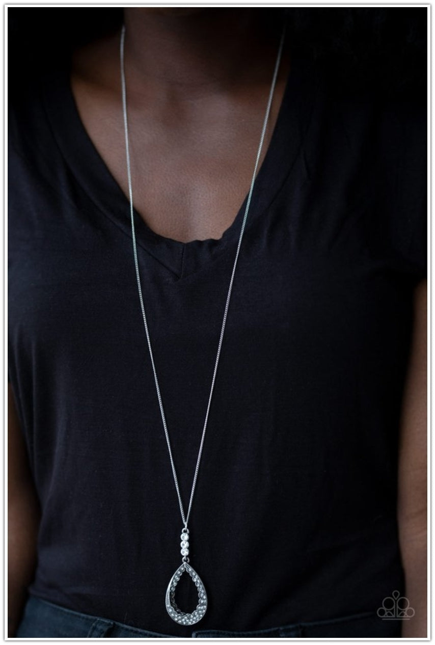 Necklace: Infused with a lengthened silver chain, three white rhinestones give way to a glittery teardrop pendant. Dotted with dainty silver studs, the inside and outside of a silver teardrop is encrusted in white rhinestones for a regal look. Features an adjustable clasp closure.